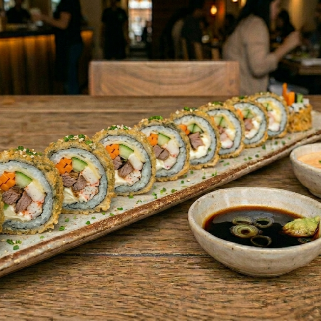 Rollo empanizado, con pepino zanahoria, queso philadelphia y arrachera., incluye salsa soya y aderezo chipotle.