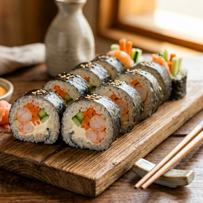 Rollo natural, con queso philadelphia, zanahoria, pepino, camaron; incluye salsa soya y aderezo chipotle.