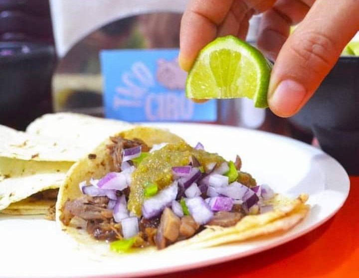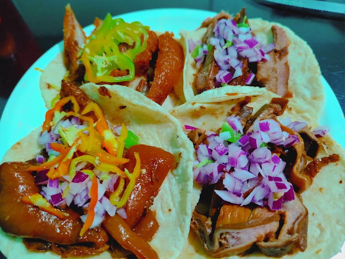 Deliciosos taco de harina de maiz de carnitas de cerdo, con la sazón especial de la casa.+ cebolla morada y hamabenor con limon