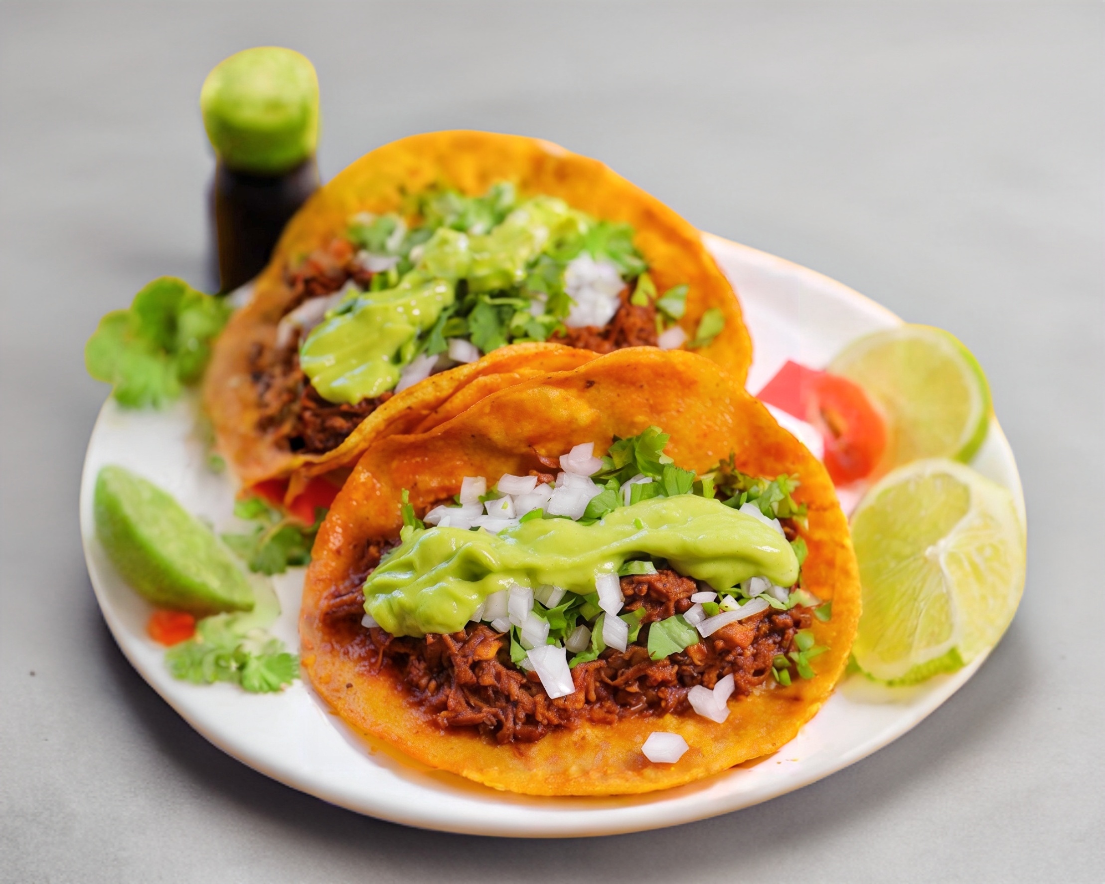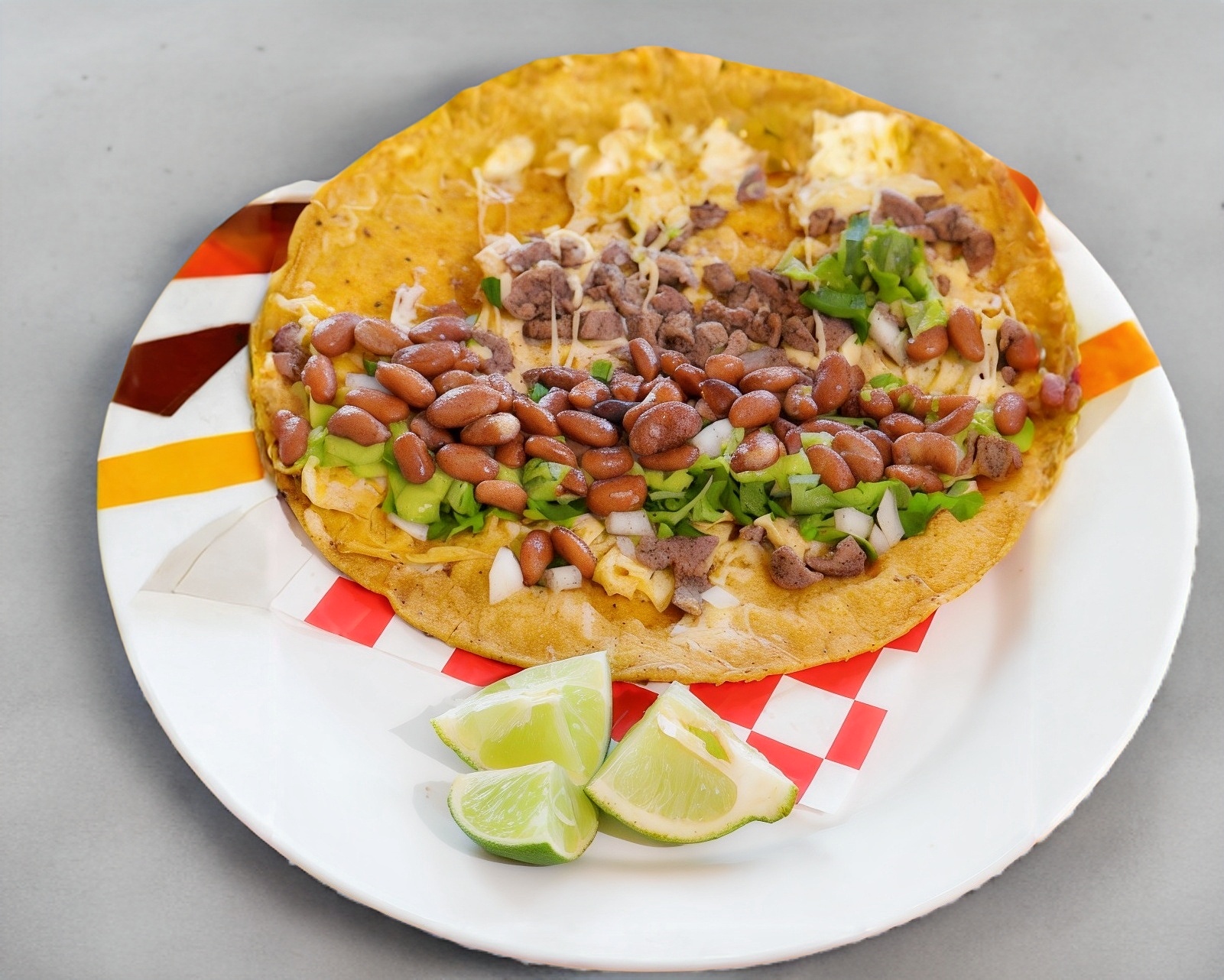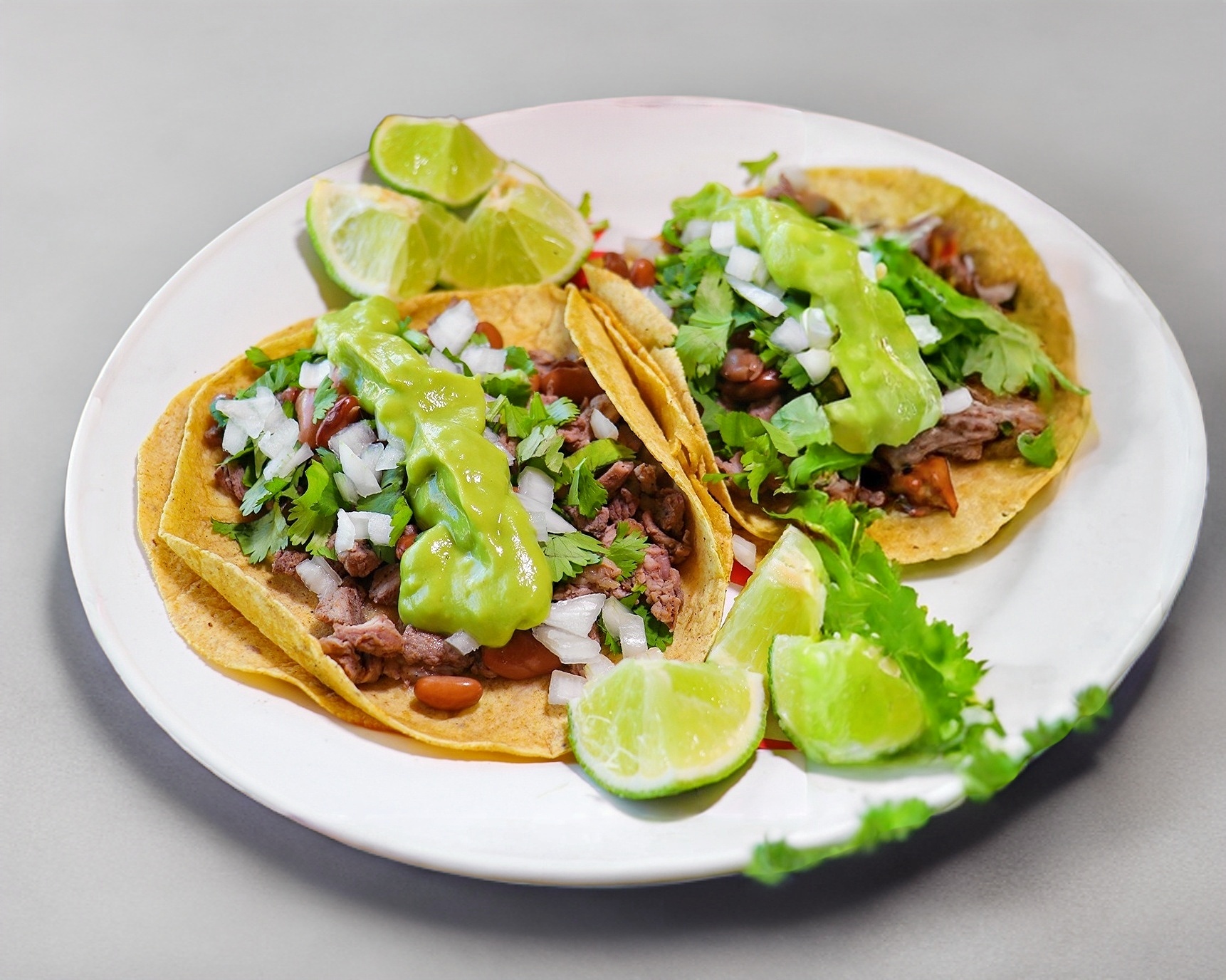 Platillo personal 2 tortillas de maíz ,carne asada, frijoles, queso, cebolla, cilantro y guacamole.
