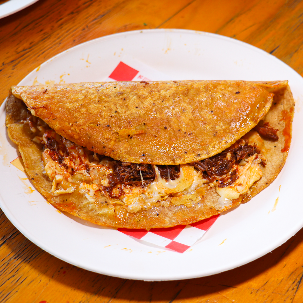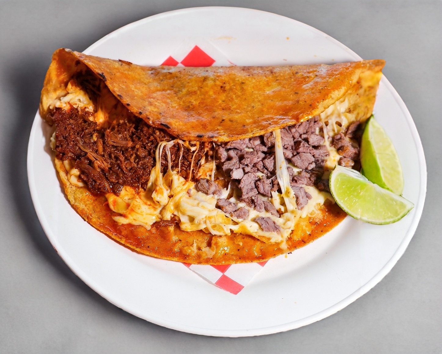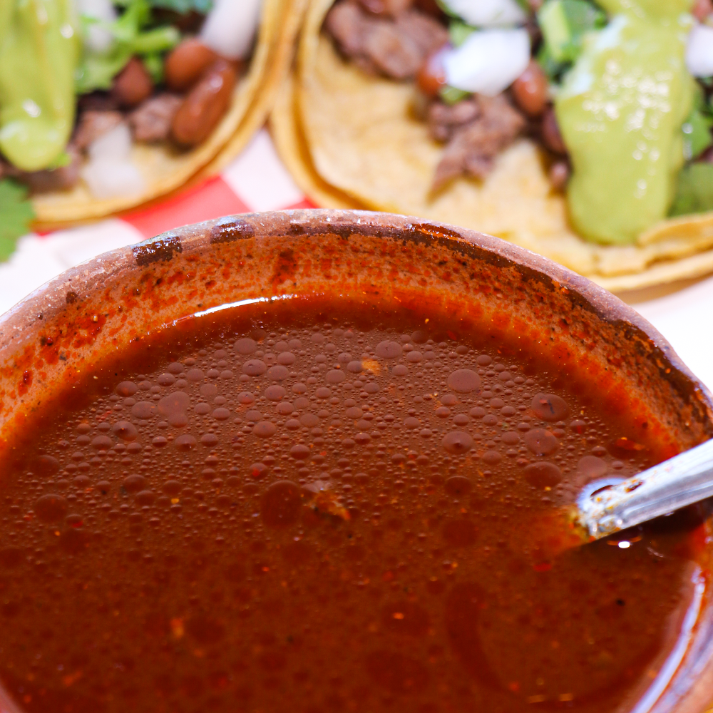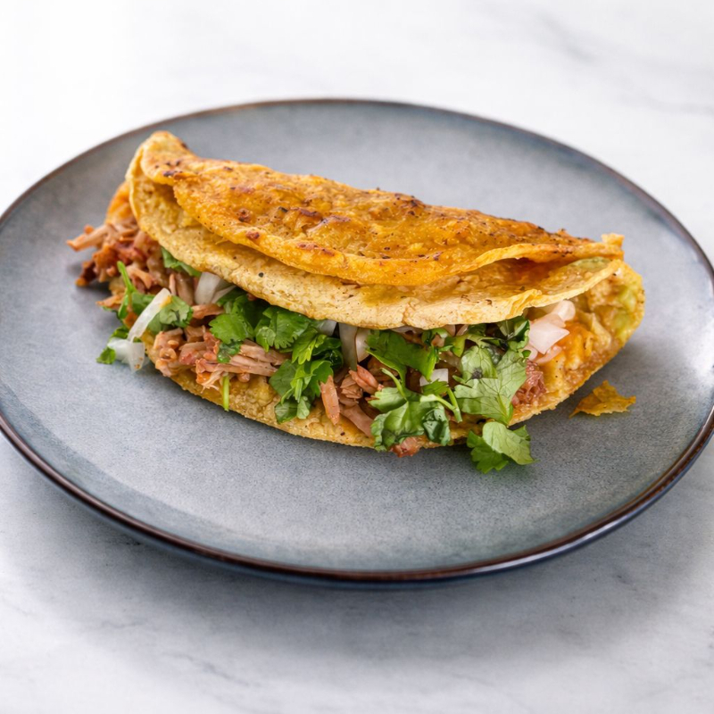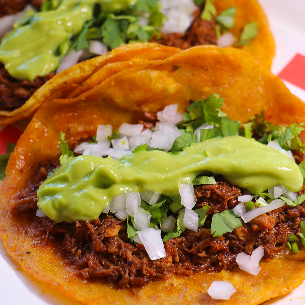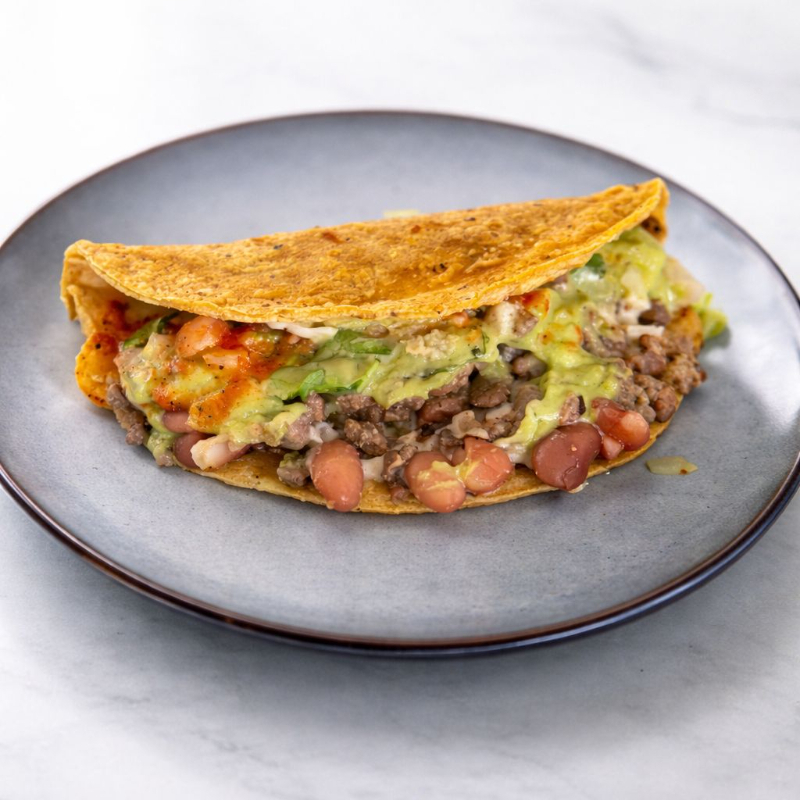 1 tortilla contiene carne, frijoles, guacamole, cebolla y cilantro.