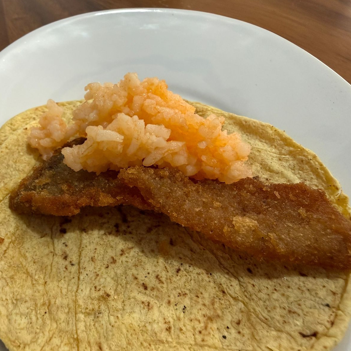 Taco con tortilla de maiz con filete de pescado empanizado con una porcion de arroz rojo