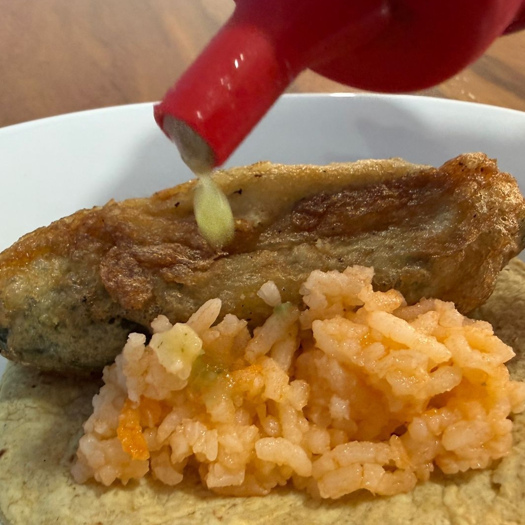 Taco de chile jalapeño relleno de pulpa de camaron con queso mozarella acompañado de una porcion de arroz rojo