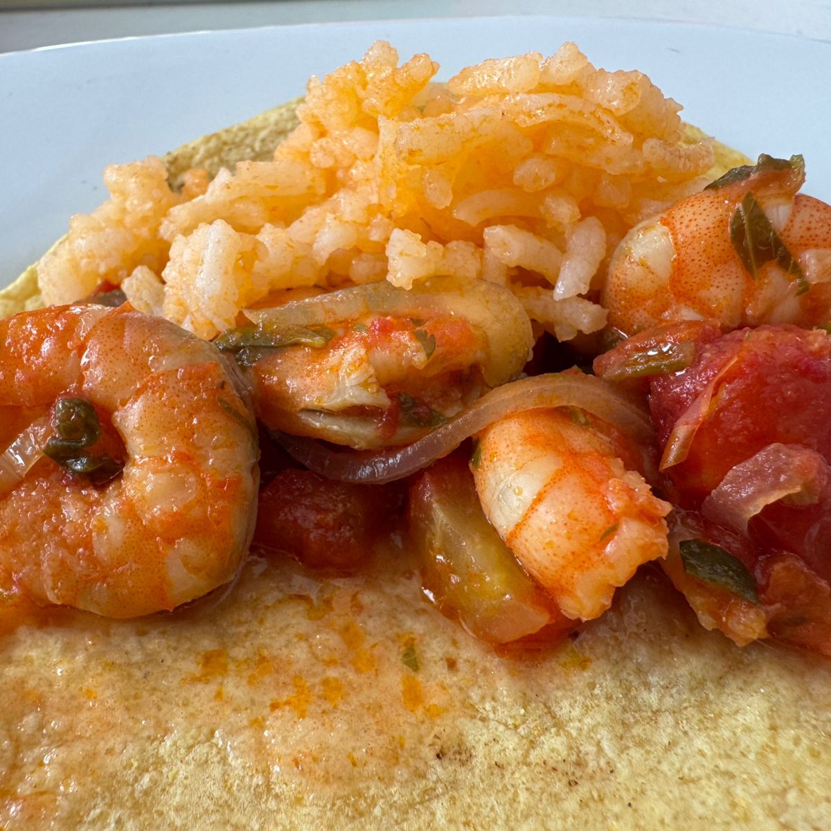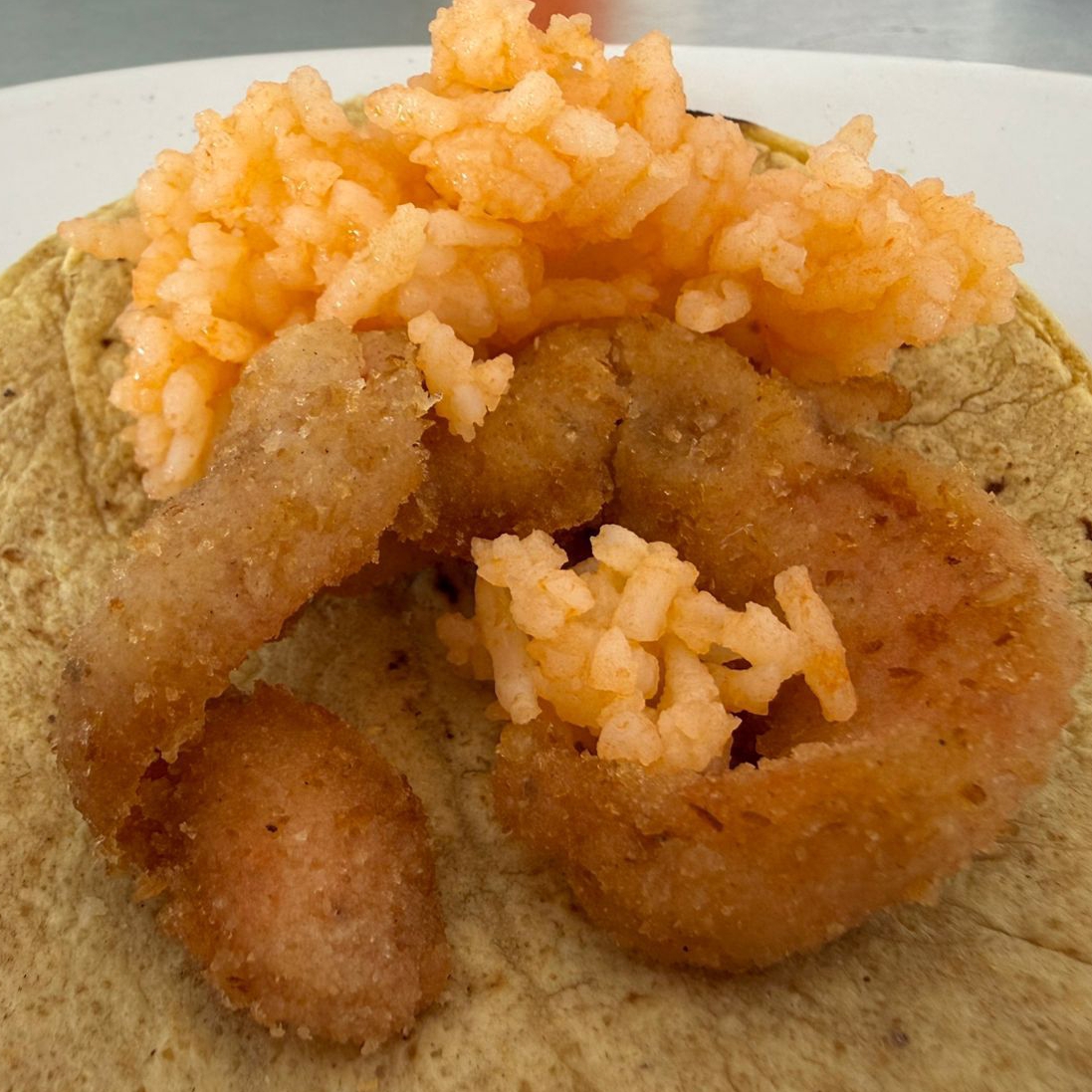 taco con tortilla de maiz con pulpa de camaron y ensalada de tomate, cebolla y cilantro acompañado de arroz