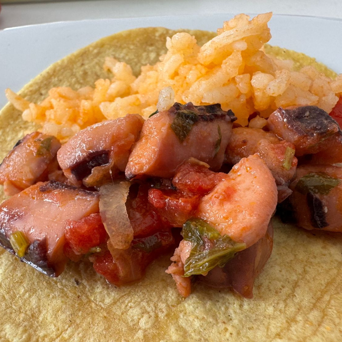 Taco de tortilla de maiz con tentaculos de pulpo con ensalade de tomate cebolla y cilantro con una porcion de arroz rojo