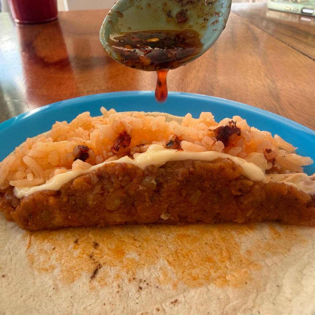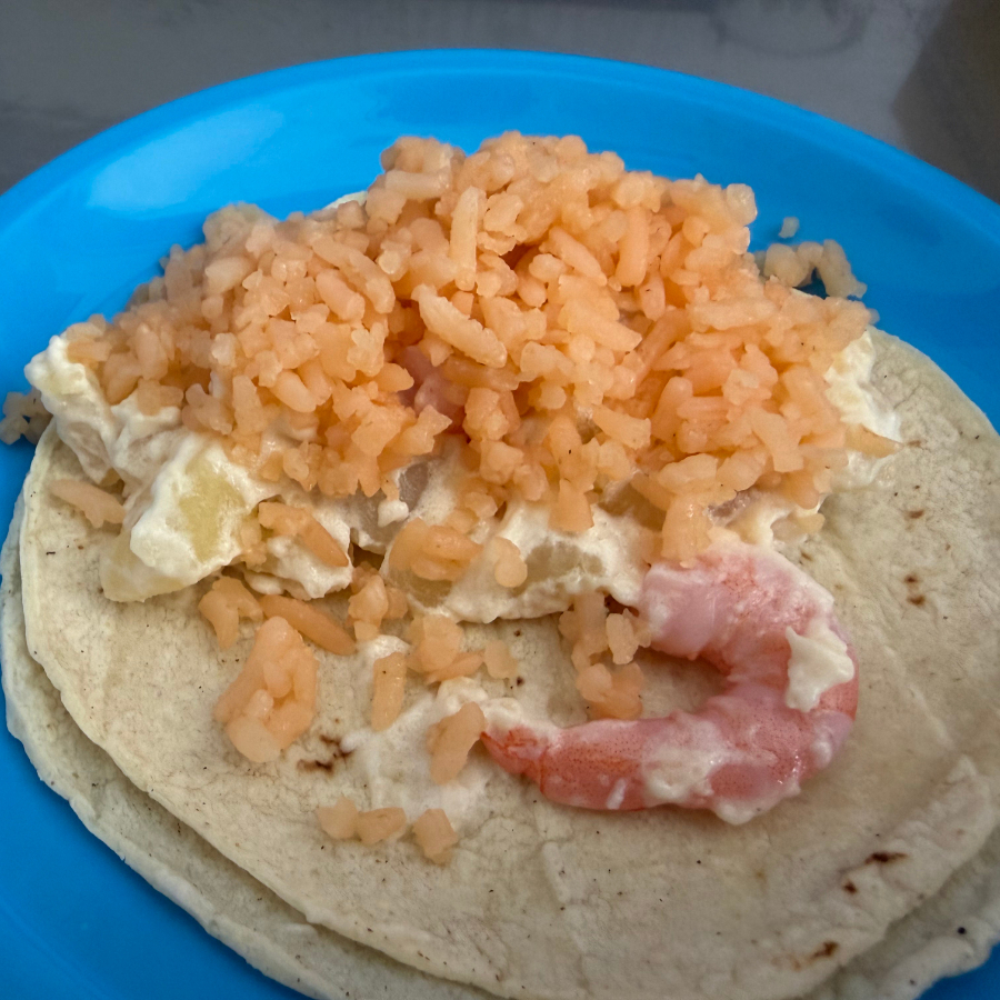 Taco de tortilla de maiz con pulpa de camaron con pure de papa y mayonesa acompañado de una porcion de arroz rojo
