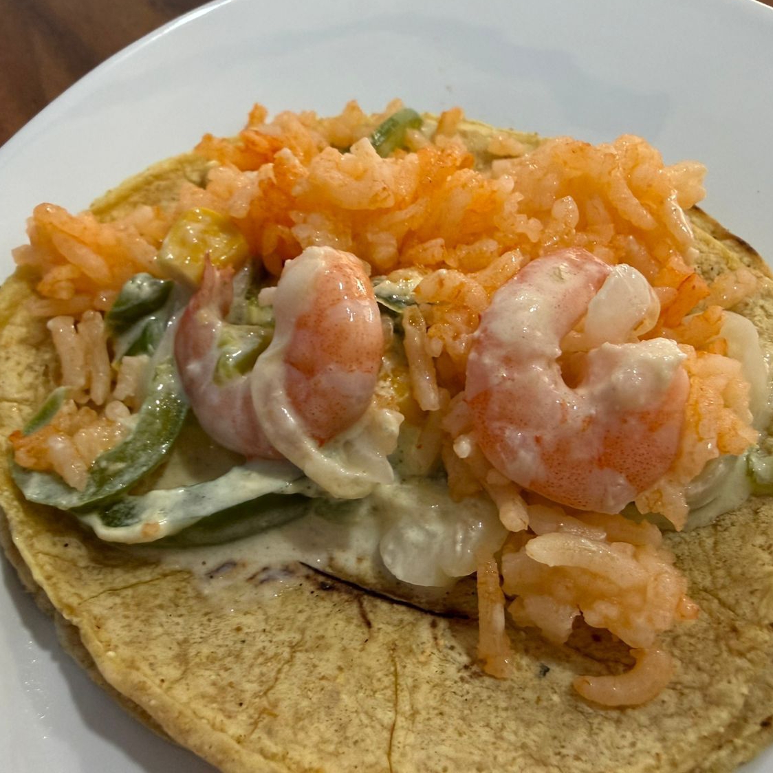 de Tortilla de Harina con una costra de queso mozarella y camaron empanizado