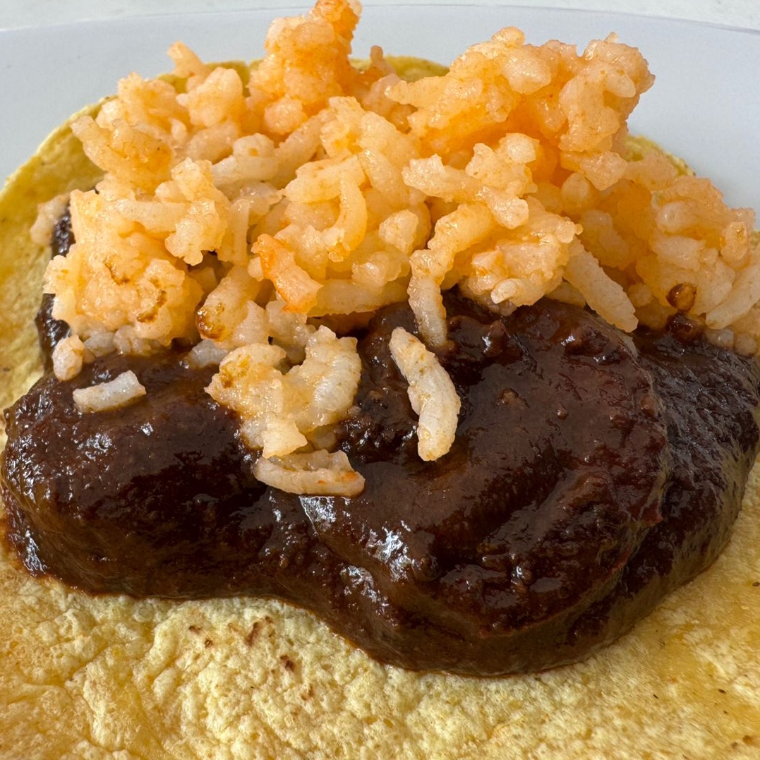 taco de tortilla de maiz con pulpa de camaron con mole chiapaneco acompañado de una porcion de arroz rojo