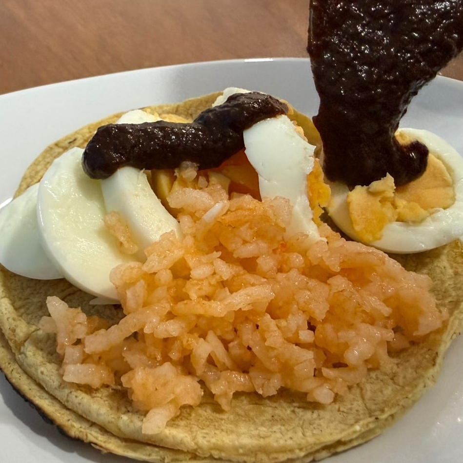 taco de huevo duro acompañado de mole chiapaneco y una porcion de arroz