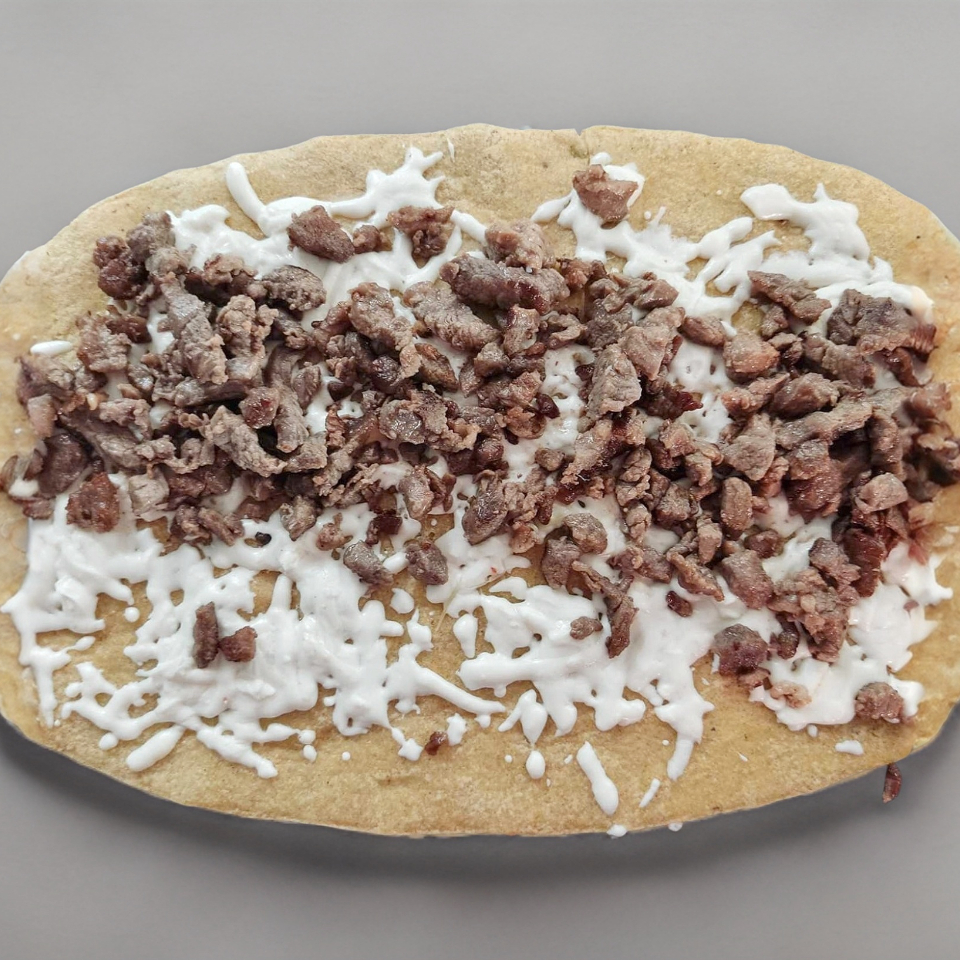 Tortilla de maíz amarillo hecha a mano (30 cm de largo), bistec de res, queso para fundir