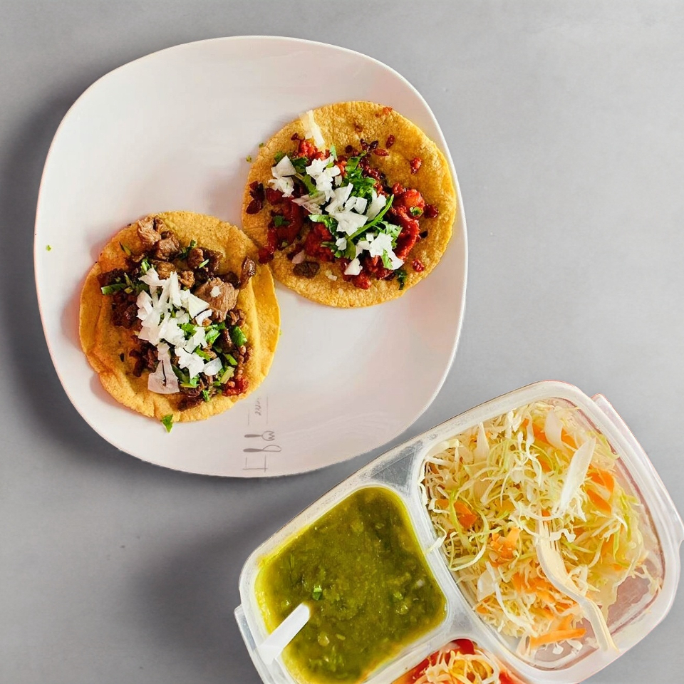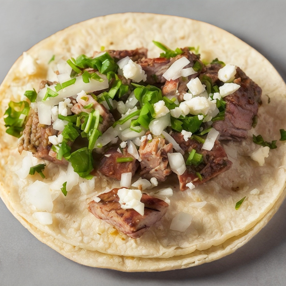 Tortilla de maíz (doble tortilla), bistec de res, chorizo de cerdo.