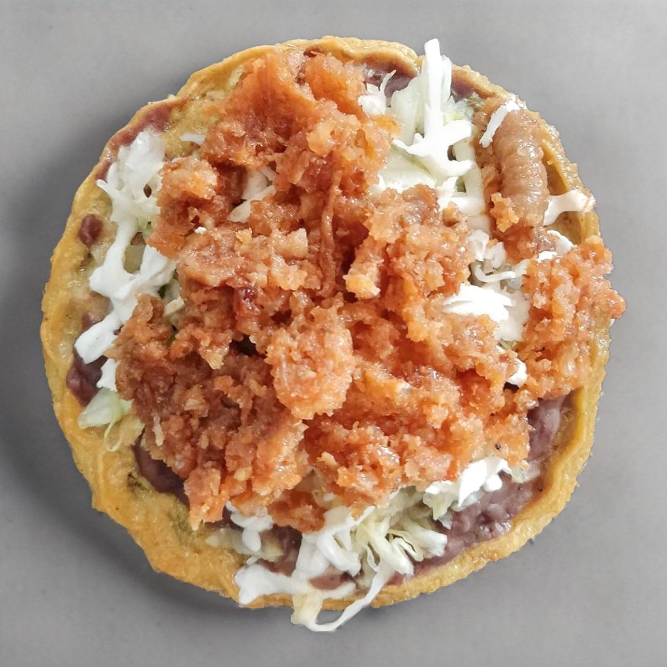 Tortilla de maíz (30 cm), queso y chicharrón guisado en salsa roja, sin picante