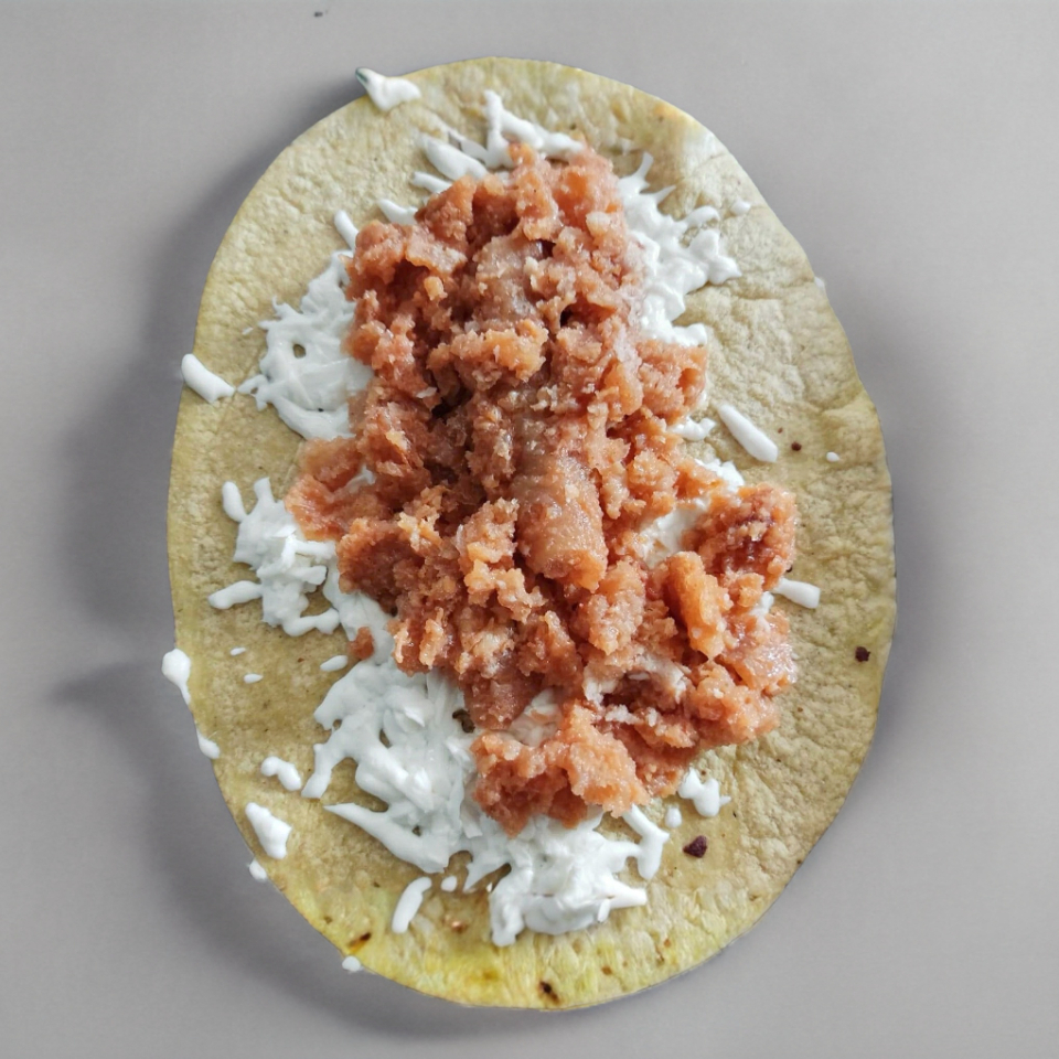 Tortilla de Harina (aprox 20 cm de largo), pierna de cerdo deshebrada, frijoles, lechuga y quesillo