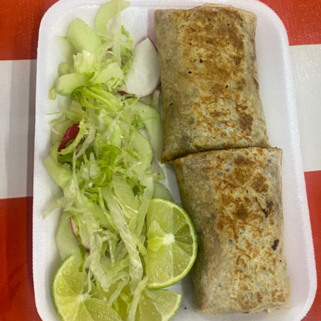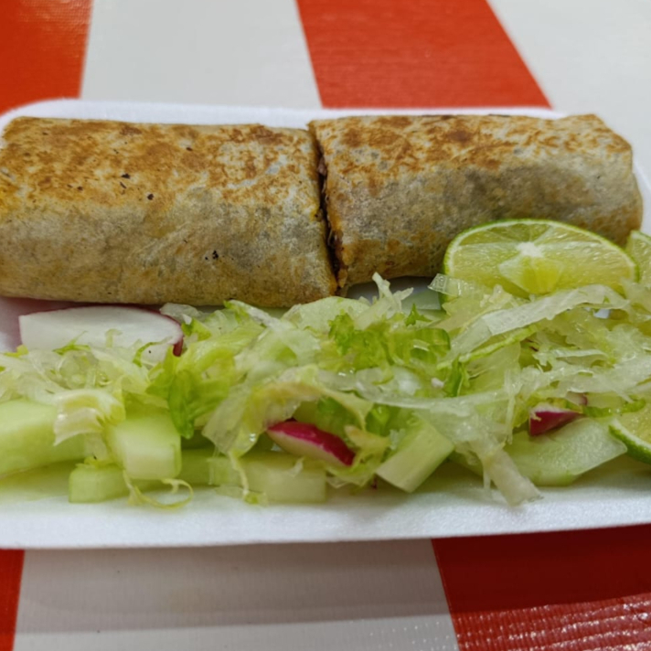 Tortilla de harina (aprox 20 cm de largo), bistec de res, frijoles, lechuga y quesillo.