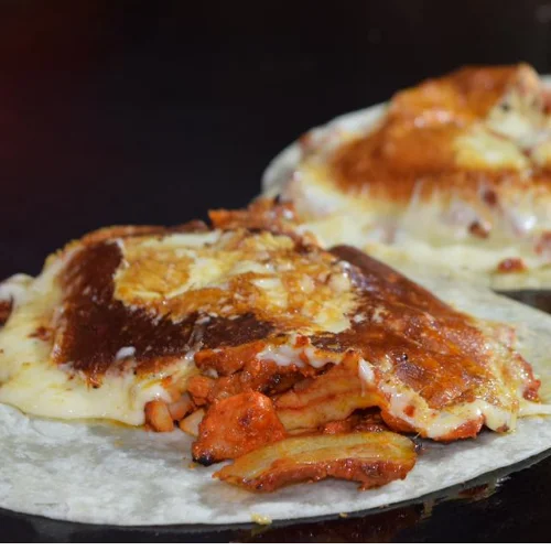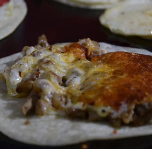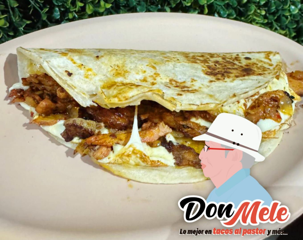 Tortillina de harina pequeña, quesillo, carne al pastor.