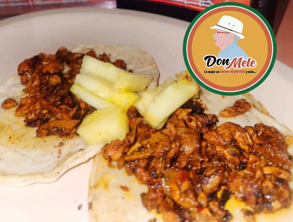 Carne al pastor a la plancha, tortilla de maíz, salsas, piña, limones, cebolla y cilantro.