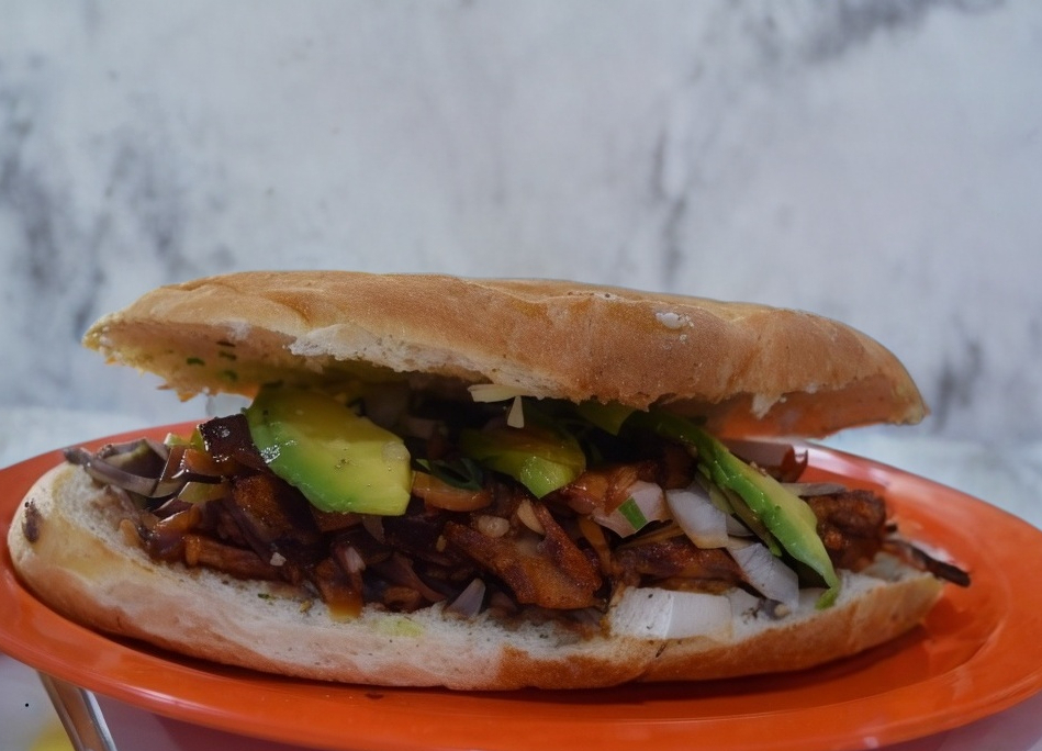 Telera, frijol, mayonesa, aguacate y bistec de res.