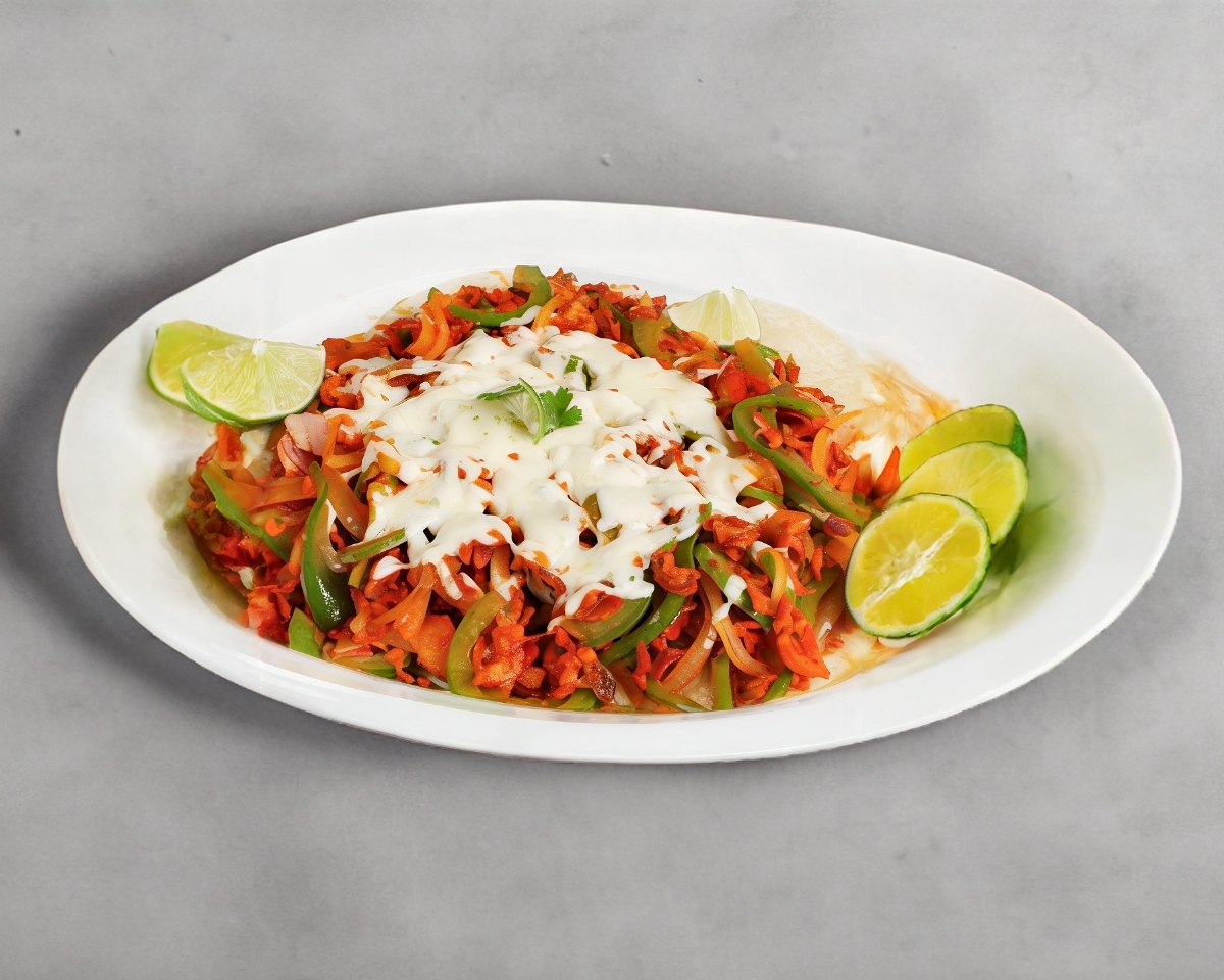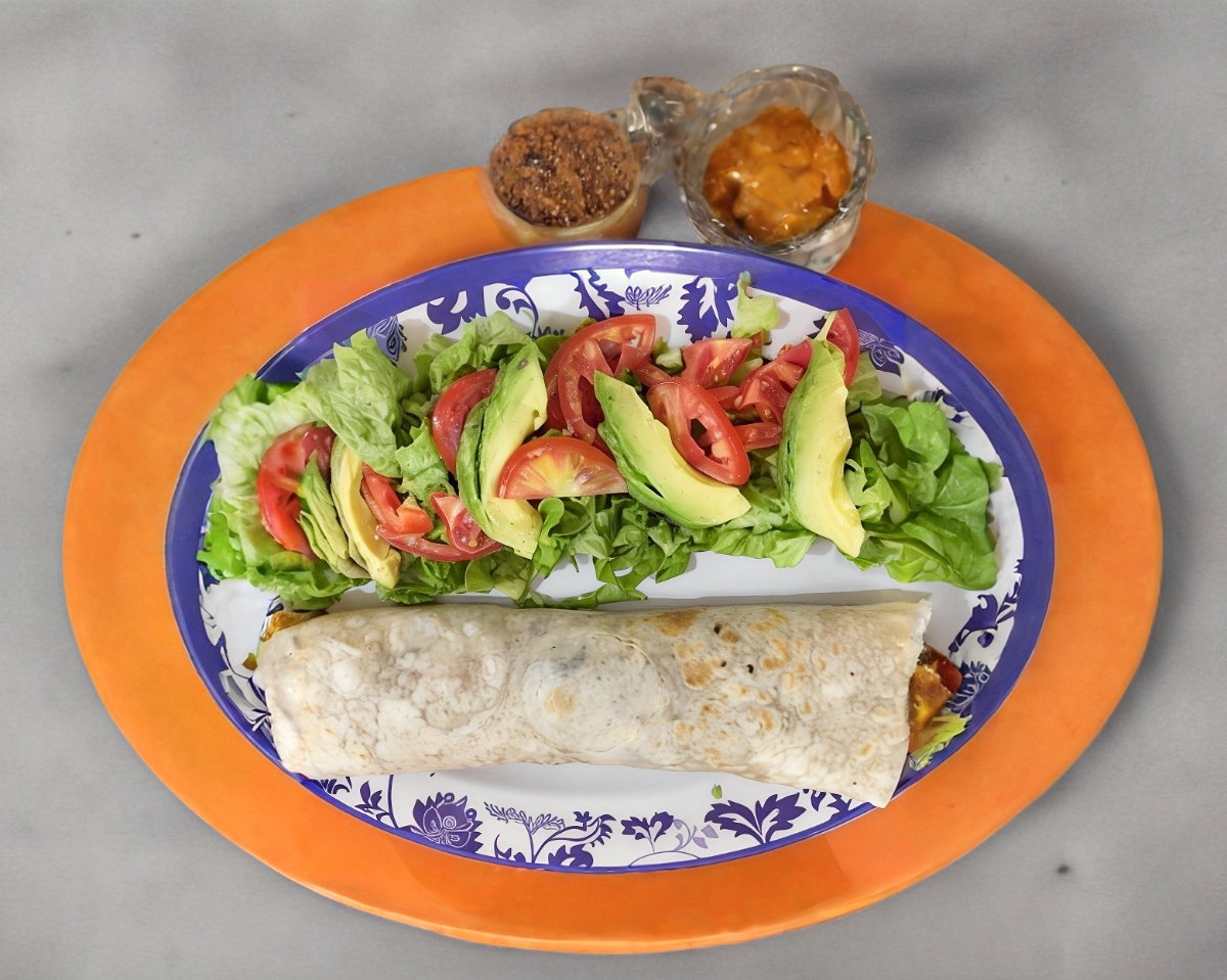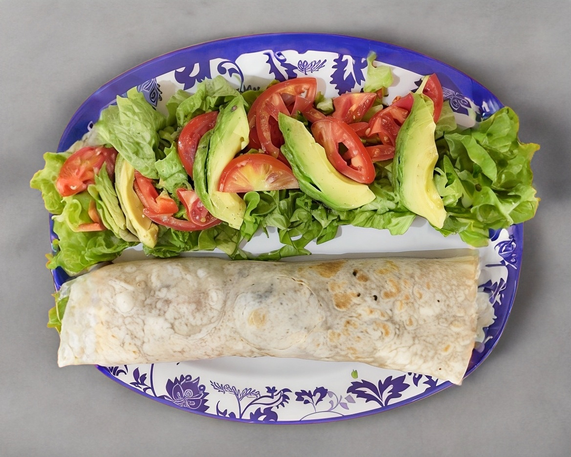 Tortilla de harina grande, carne de chuleta, cebolla, tocino, pimiento, queso y ensalada.