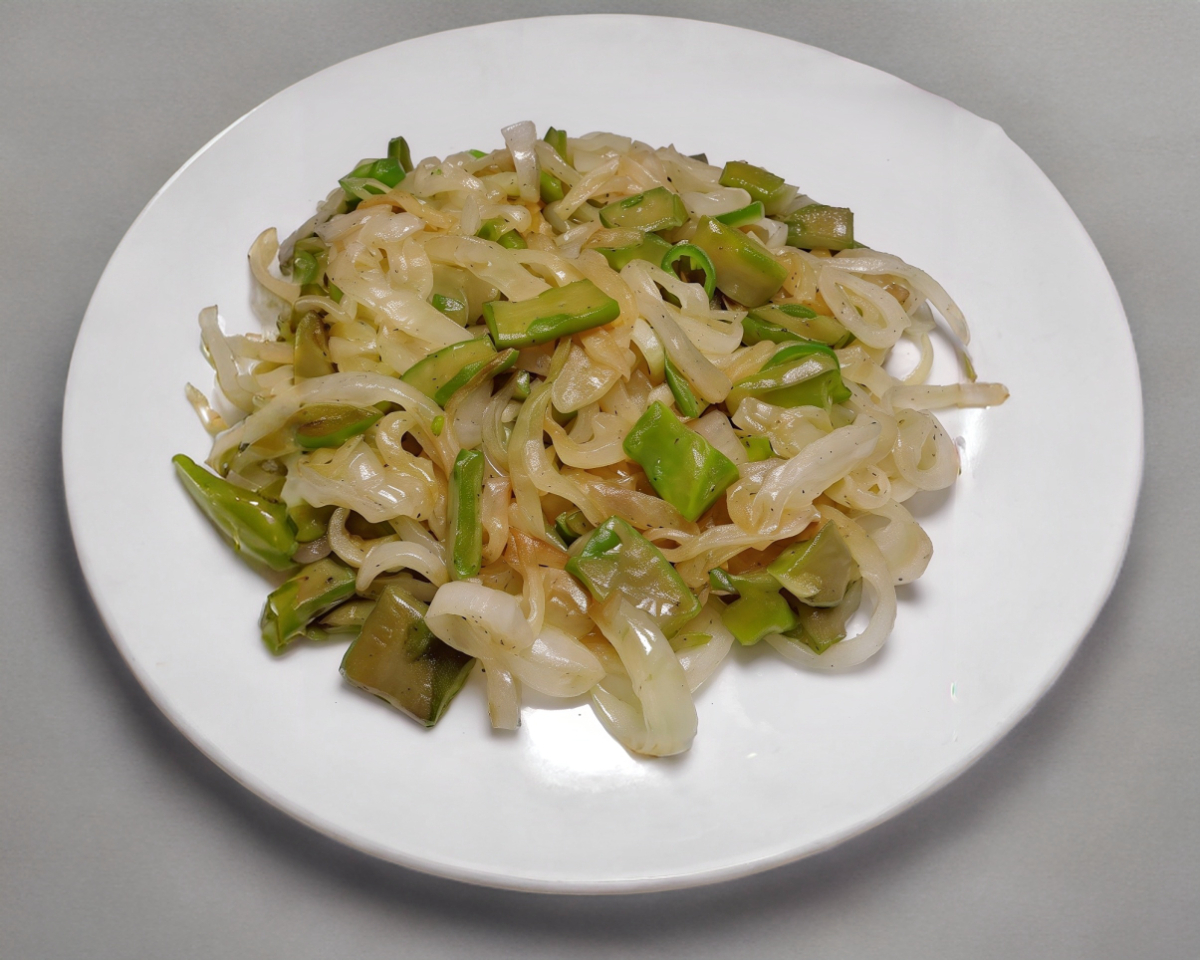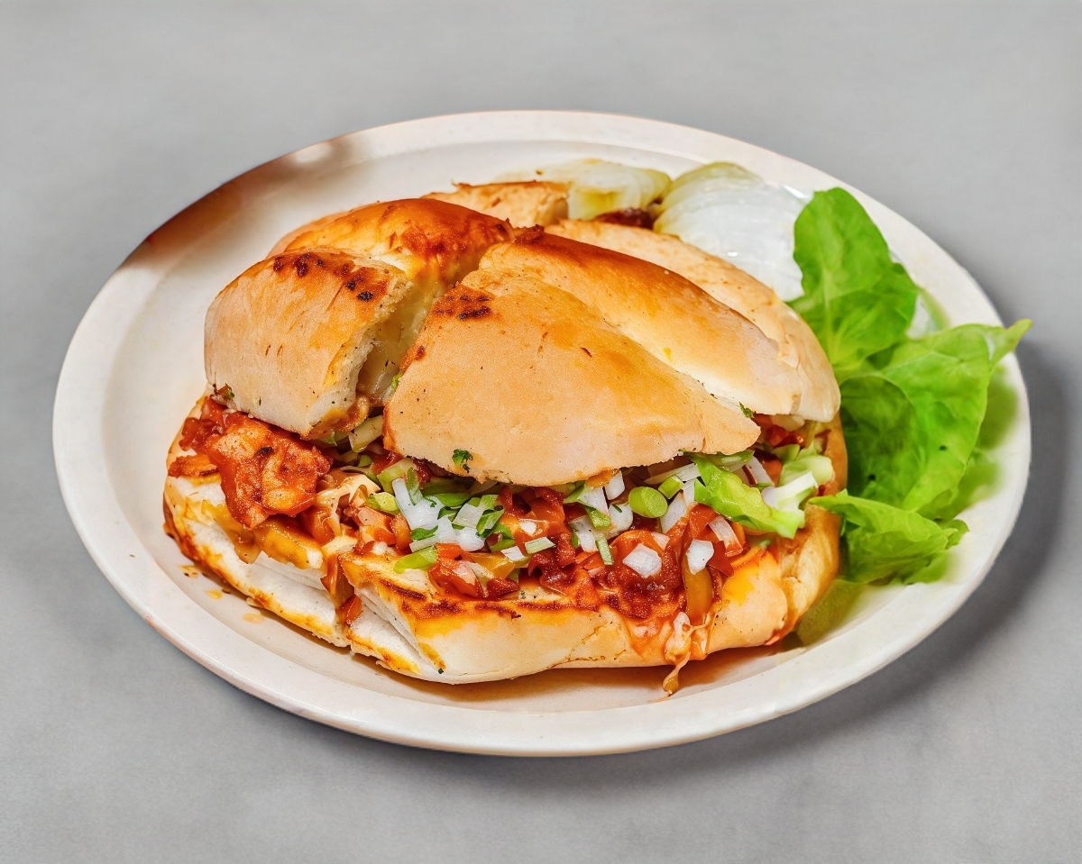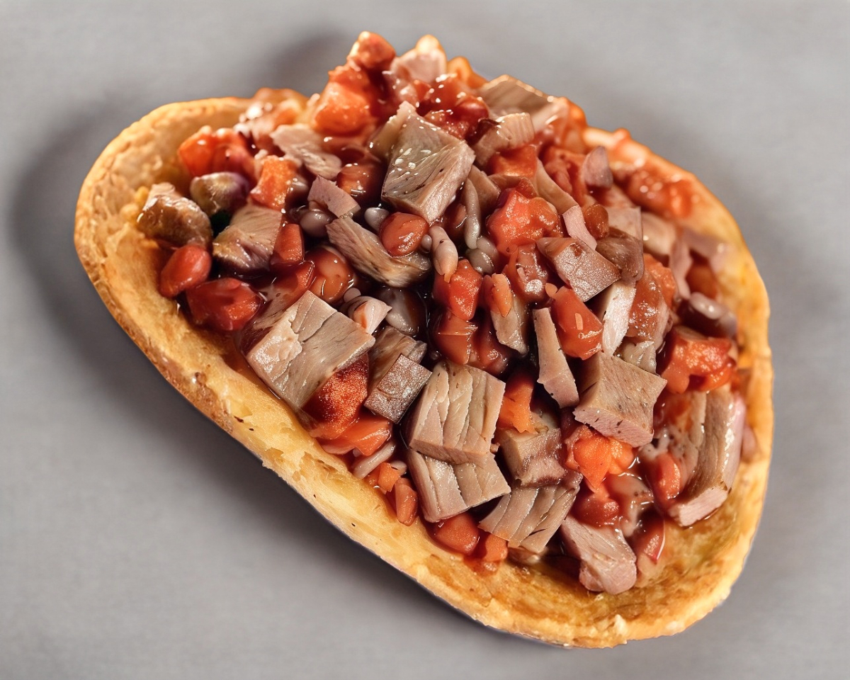 Tortilla de harina grande, carne de chuleta, cebolla, tocino, pimiento, queso y ensalada.