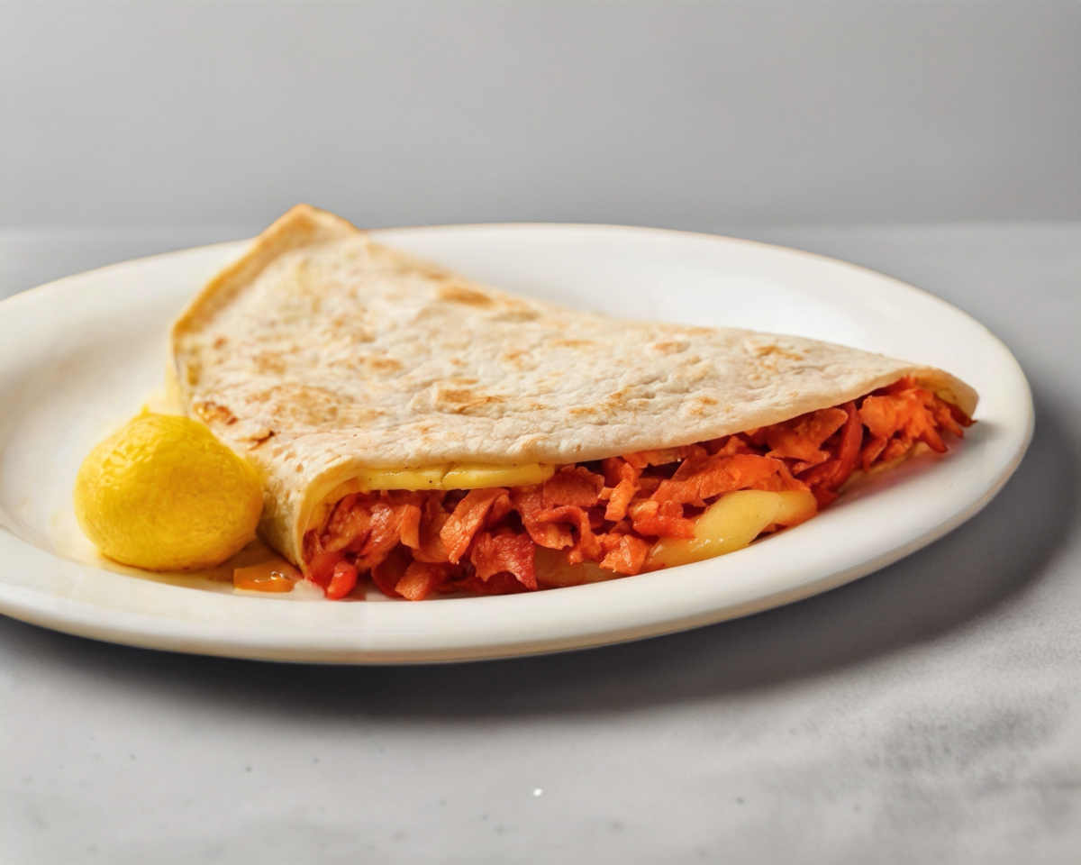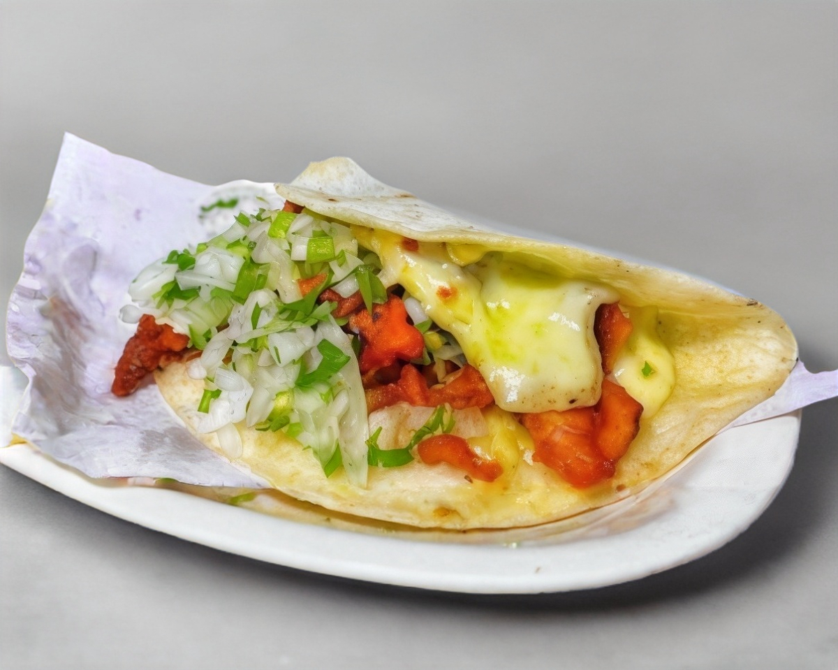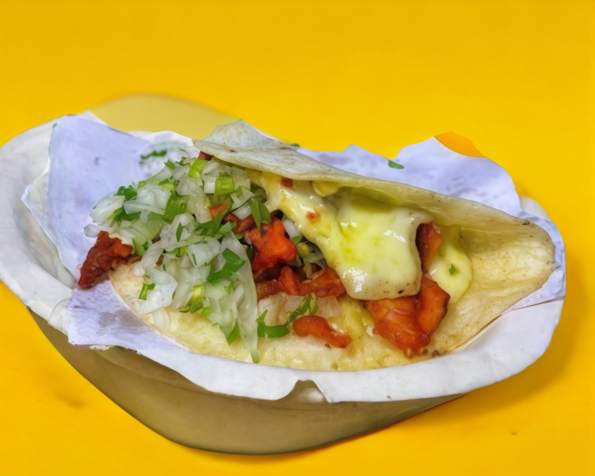 Con una tortilla de harina de tamaño normal, queso y carne al pastor.