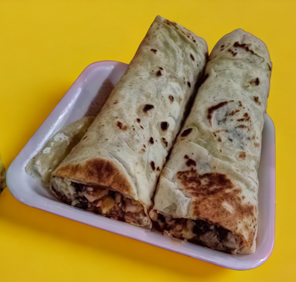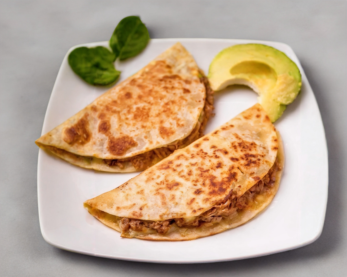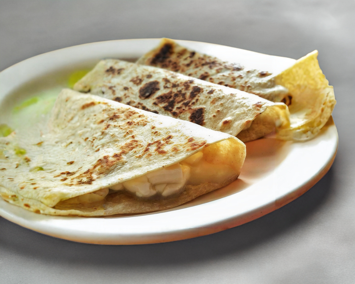 Con una tortilla de harina de tamaño normal, queso y carne al pastor.