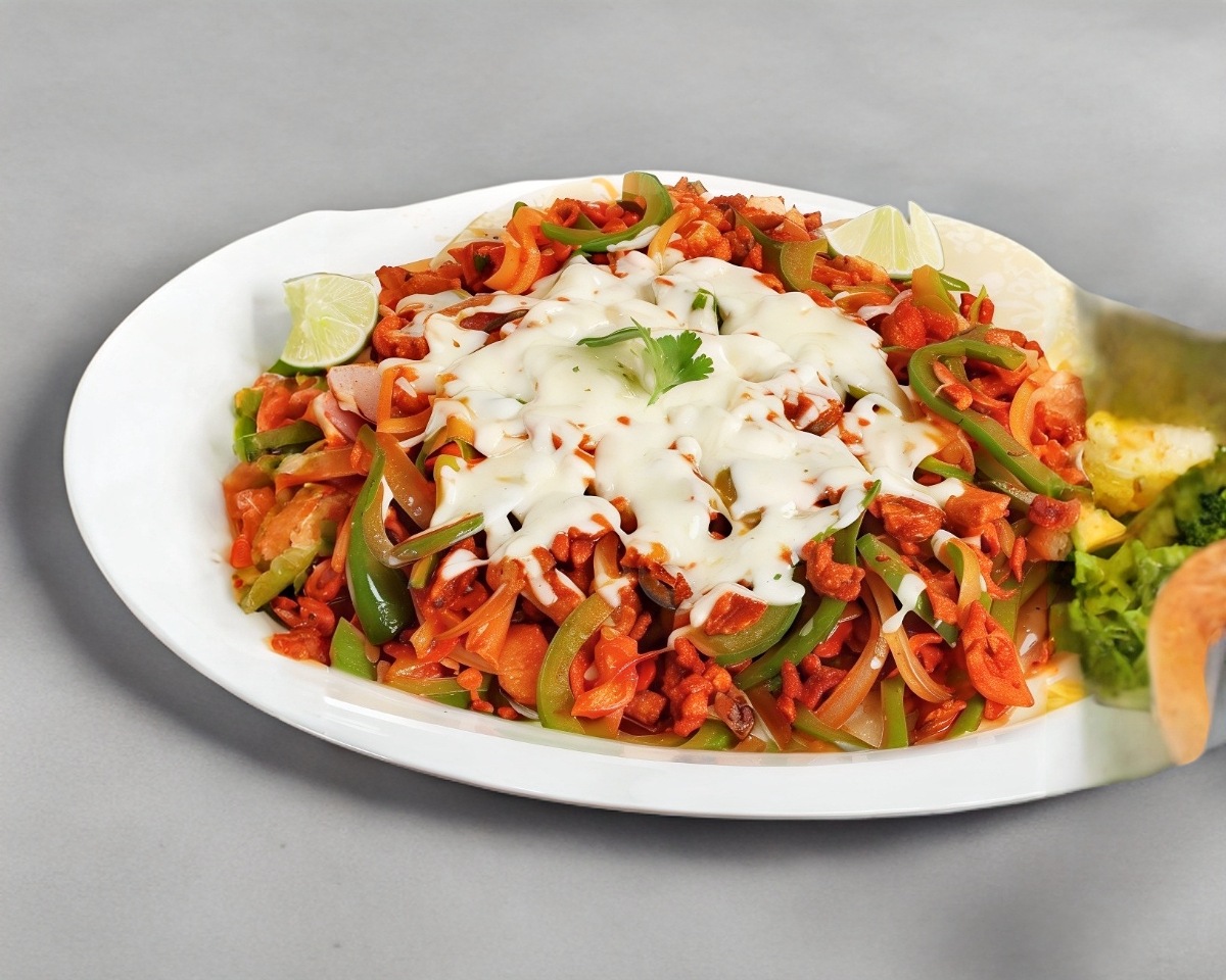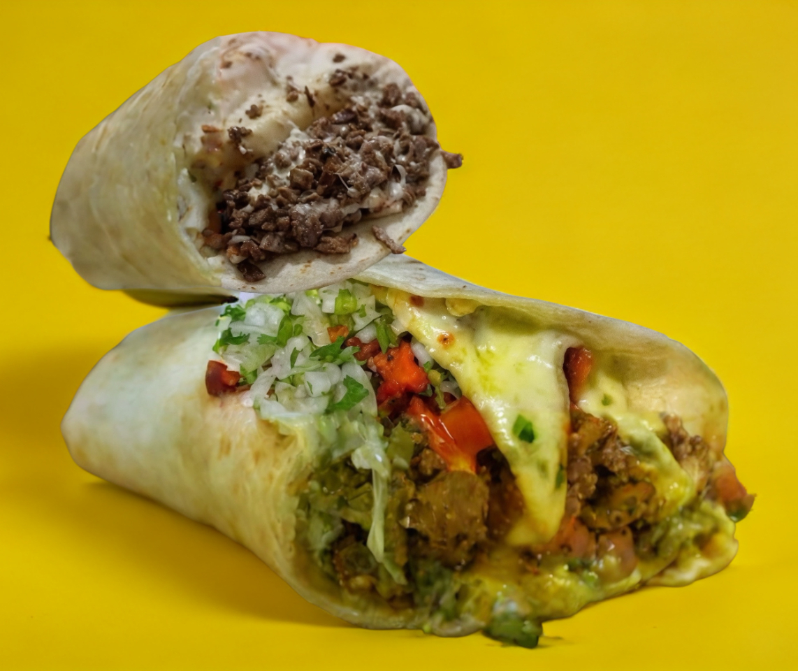 Tortilla de harina grande, pastor, sirloin, chuleta, chorizo, cebolla, tocino, pimiento y queso.