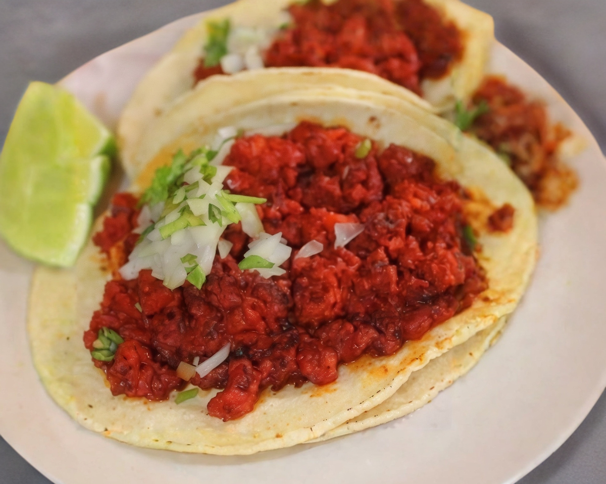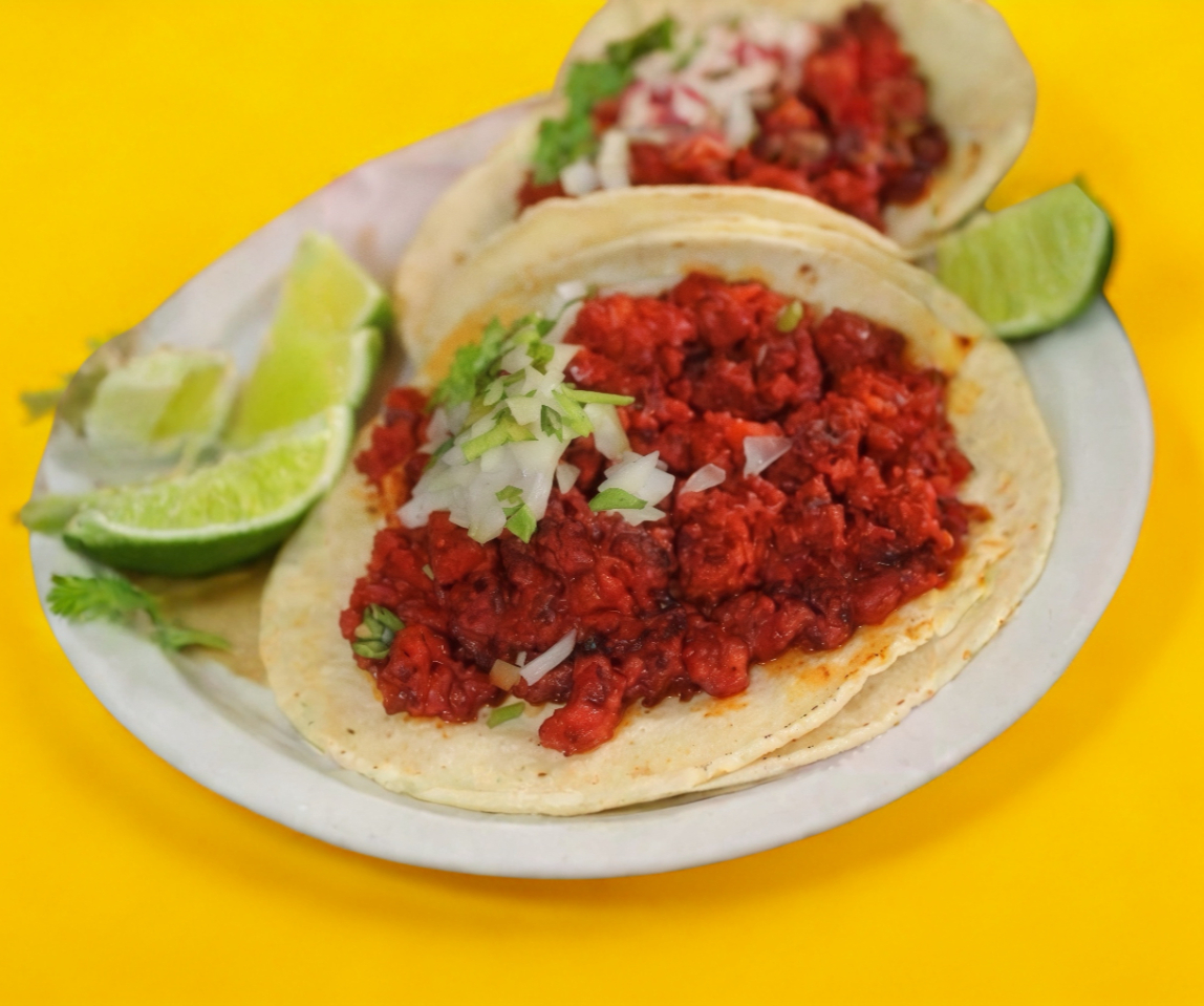 Tacos de sirloin de res, servida en tortilla taquera de maíz amarillo.