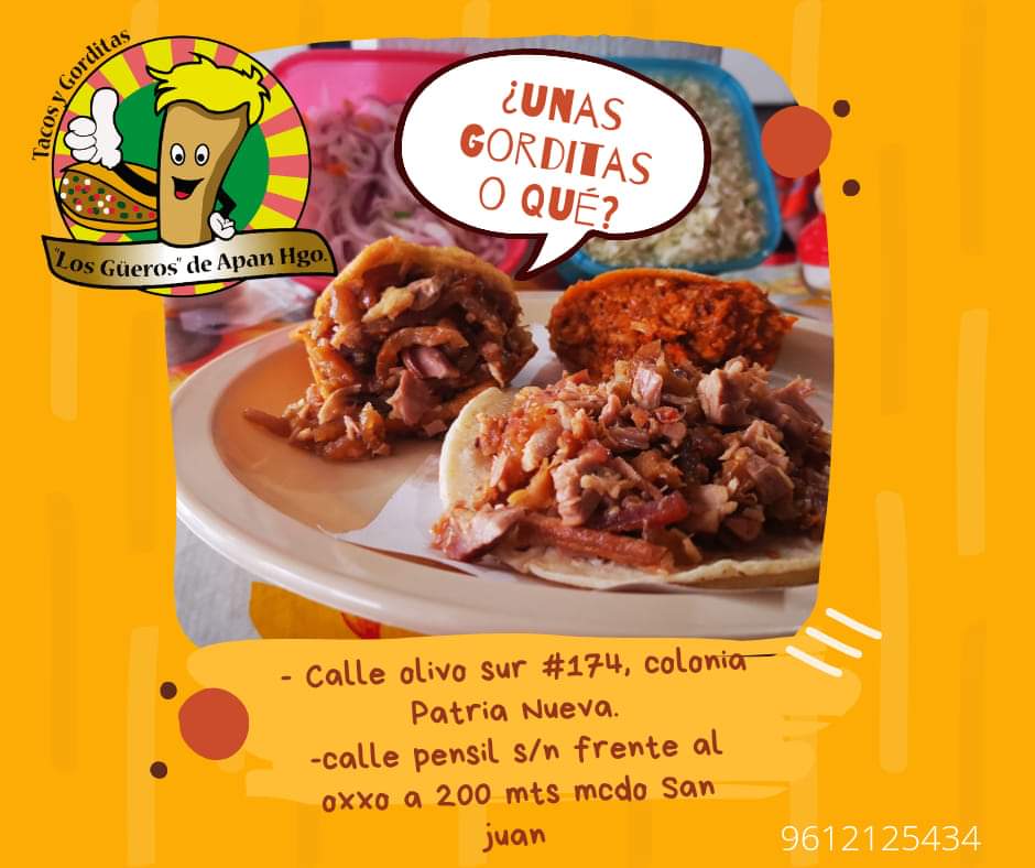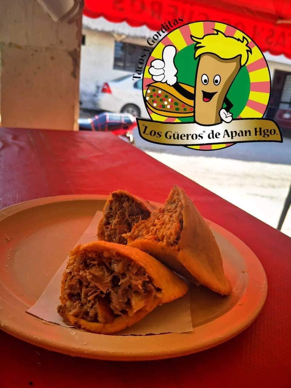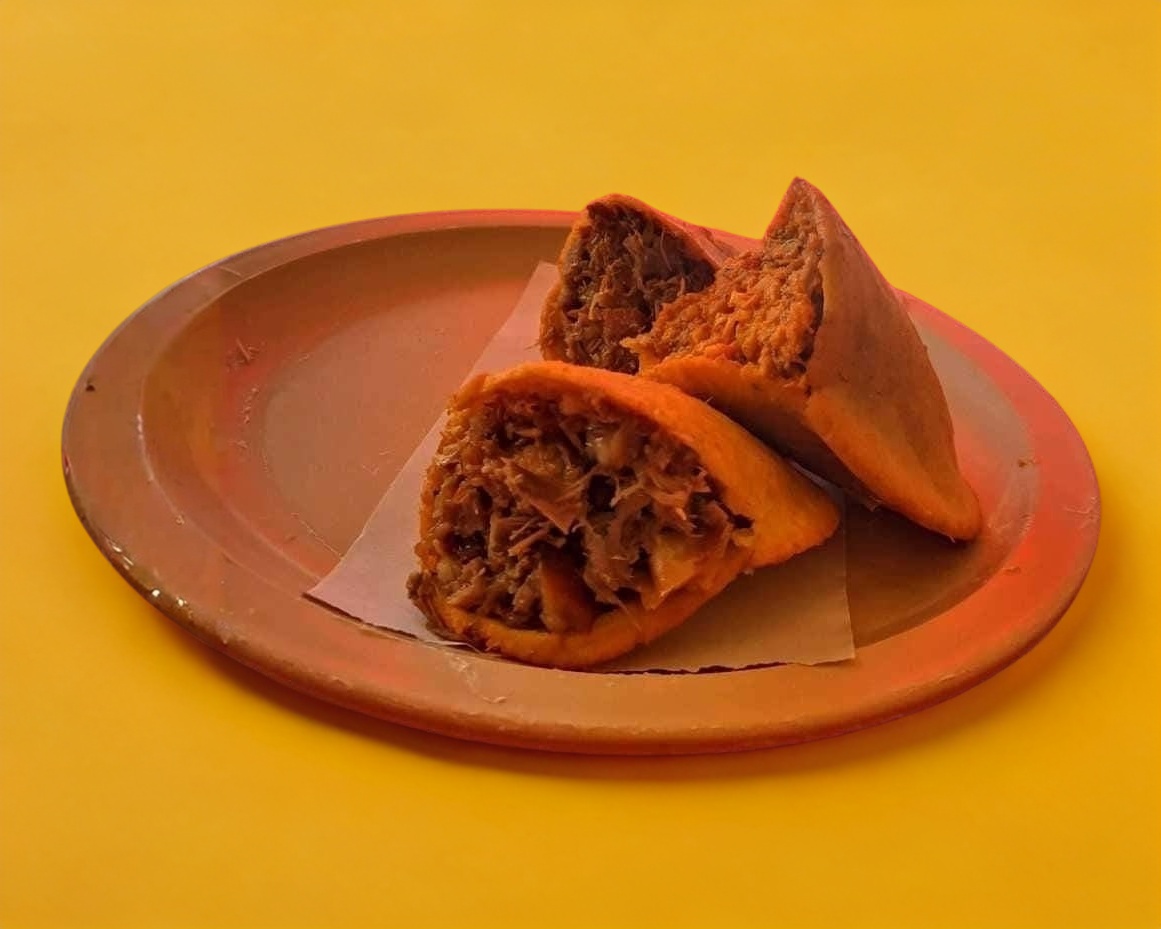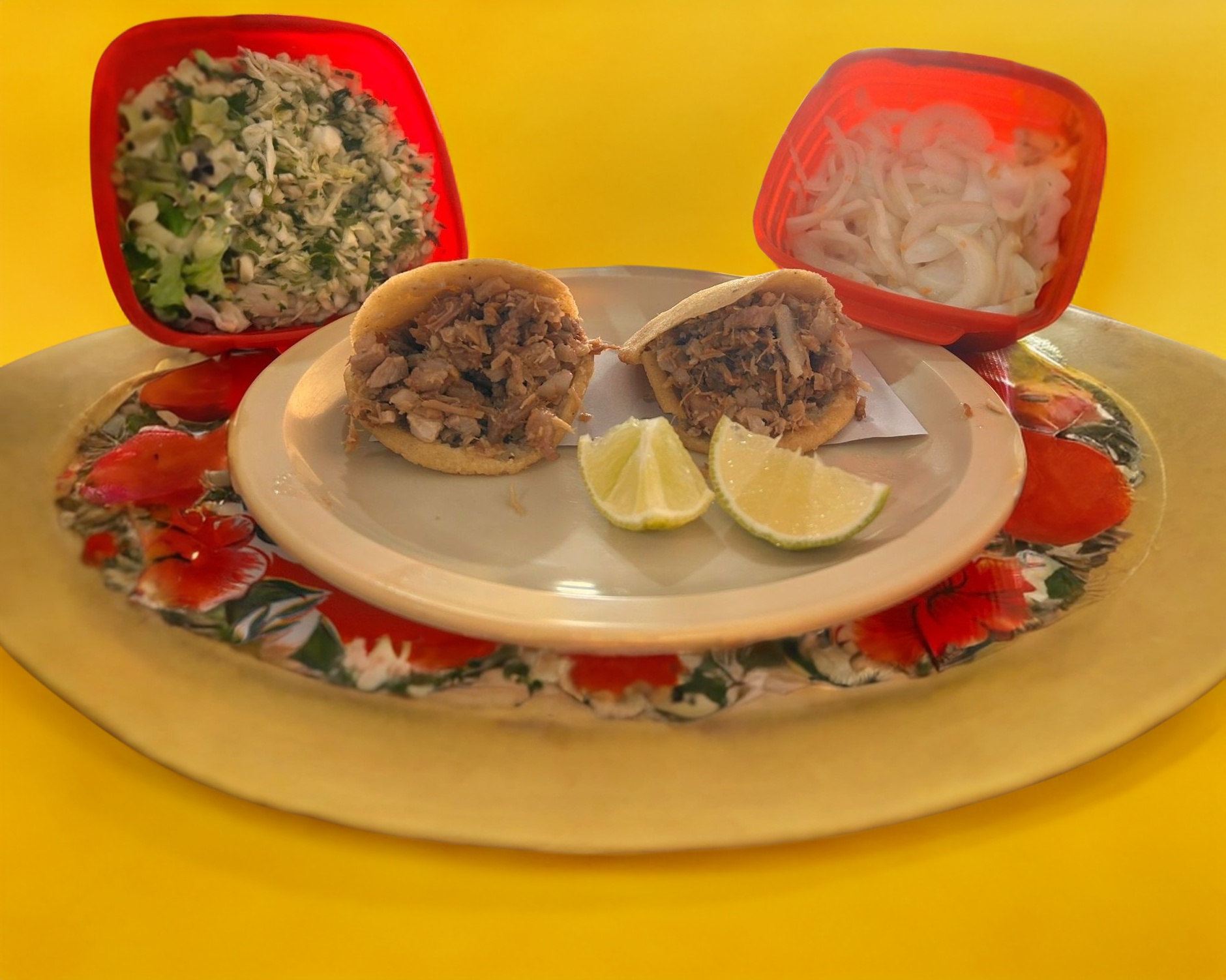 Deliciosa gordita frita rellena con 50 g de carne maciza, acompañada de salsa, repollo, limón y cebolla (aparte).