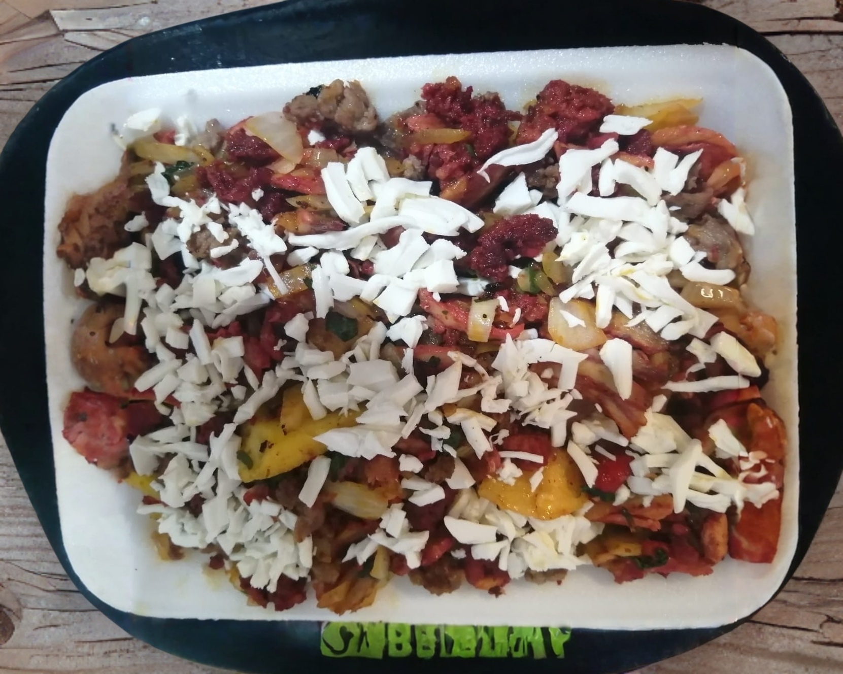 Manchego, tocineta, cebolla, pimiento morrón y carne al pastor.