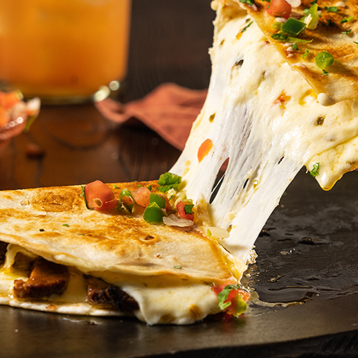 Tortilla de maíz rellena de queso y bistec de res, acompañada de su salsita, cebolla y cilantro aparte.