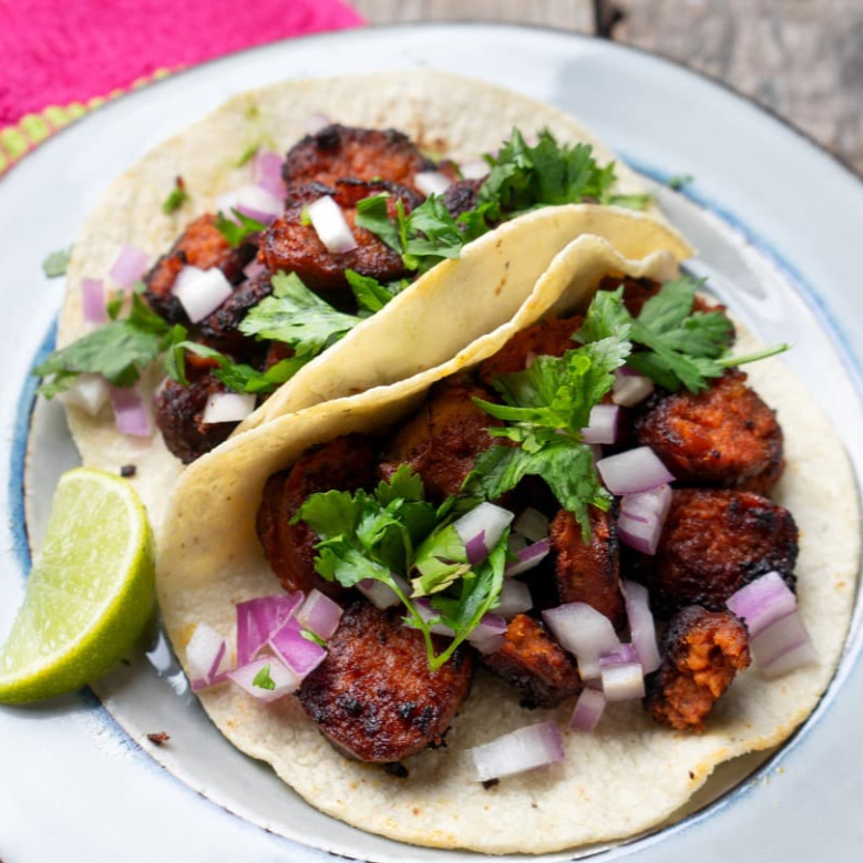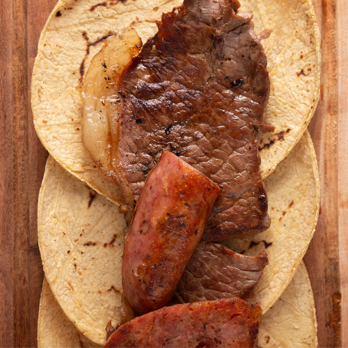 Tortilla de maíz rellena de chorizo argentino, acompañada de su salsita, cebolla y cilantro aparte.