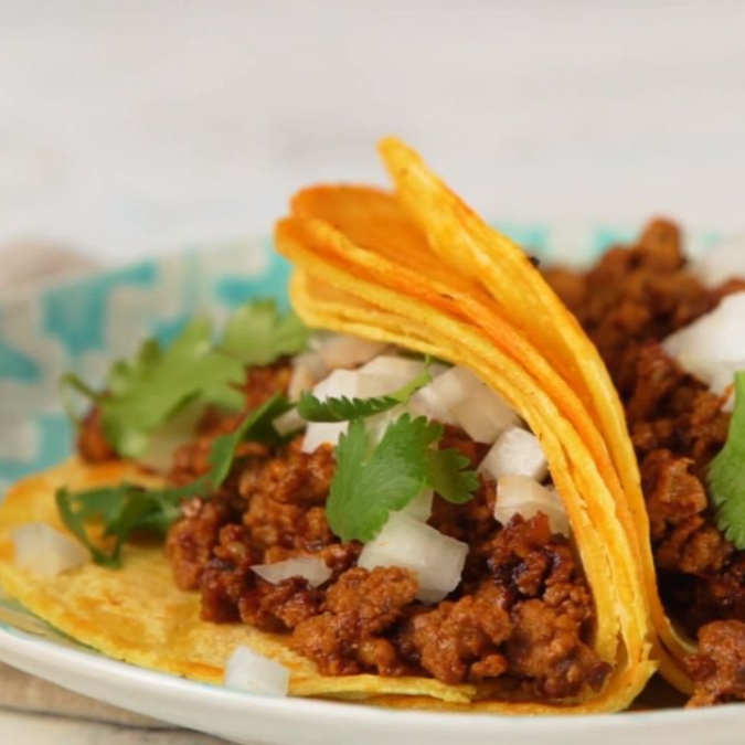 Tortilla de maíz rellena de cabeza de res, acompañada de su salsita, cebolla y cilantro aparte.