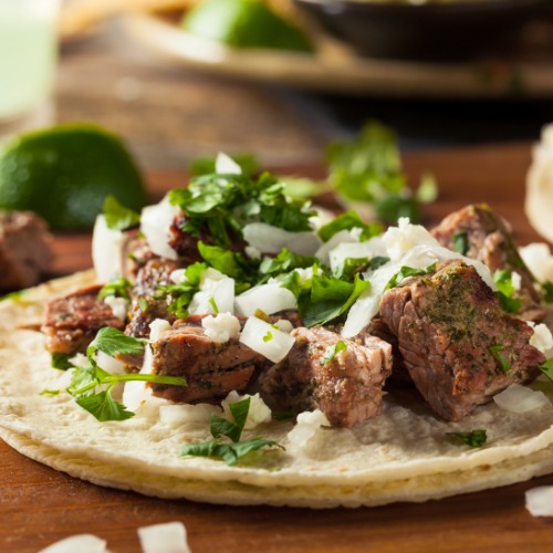 Tortilla de maíz rellena de bistec de res, acompañada de su salsita, cebolla y cilantro aparte.