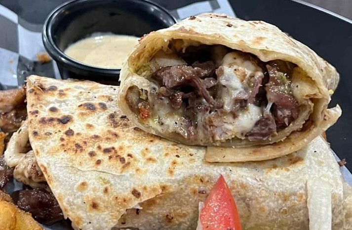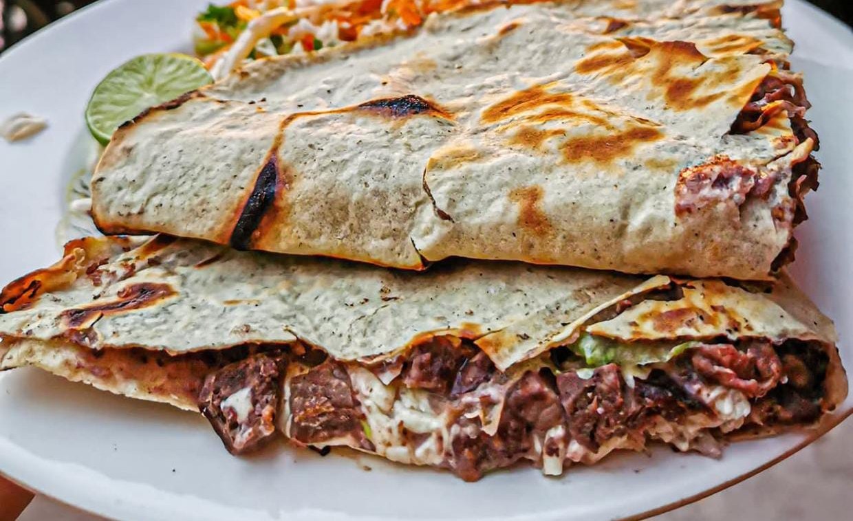 Delicioso burrito a la parrilla , relleno de frijoles, queso fundido y carne de tu eleccion