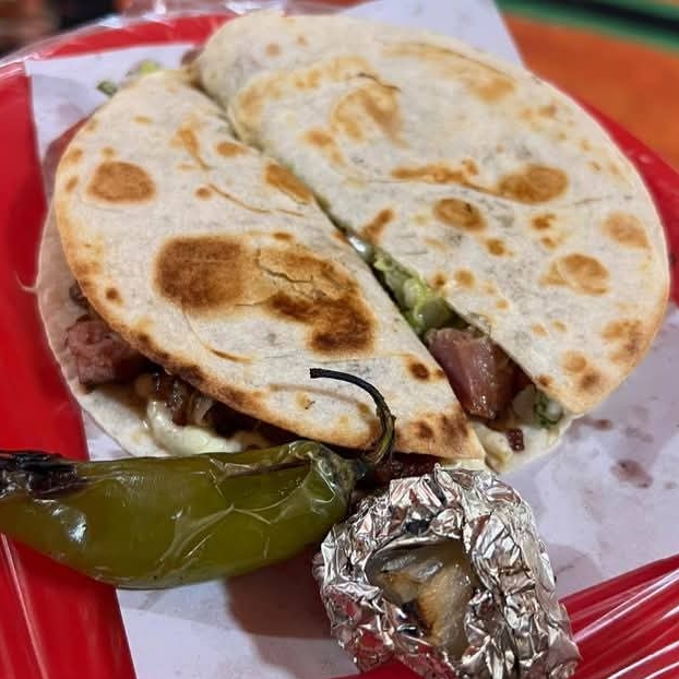 Sincronizada de harina, acompañado de queso, carne a elegir, cebolla, cilantro y guacamole