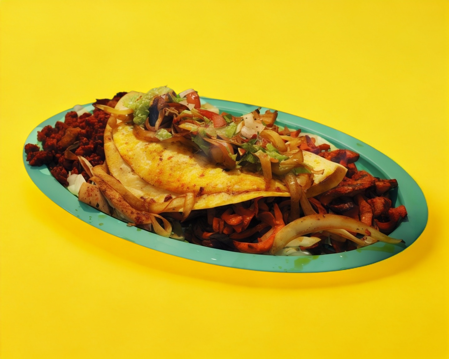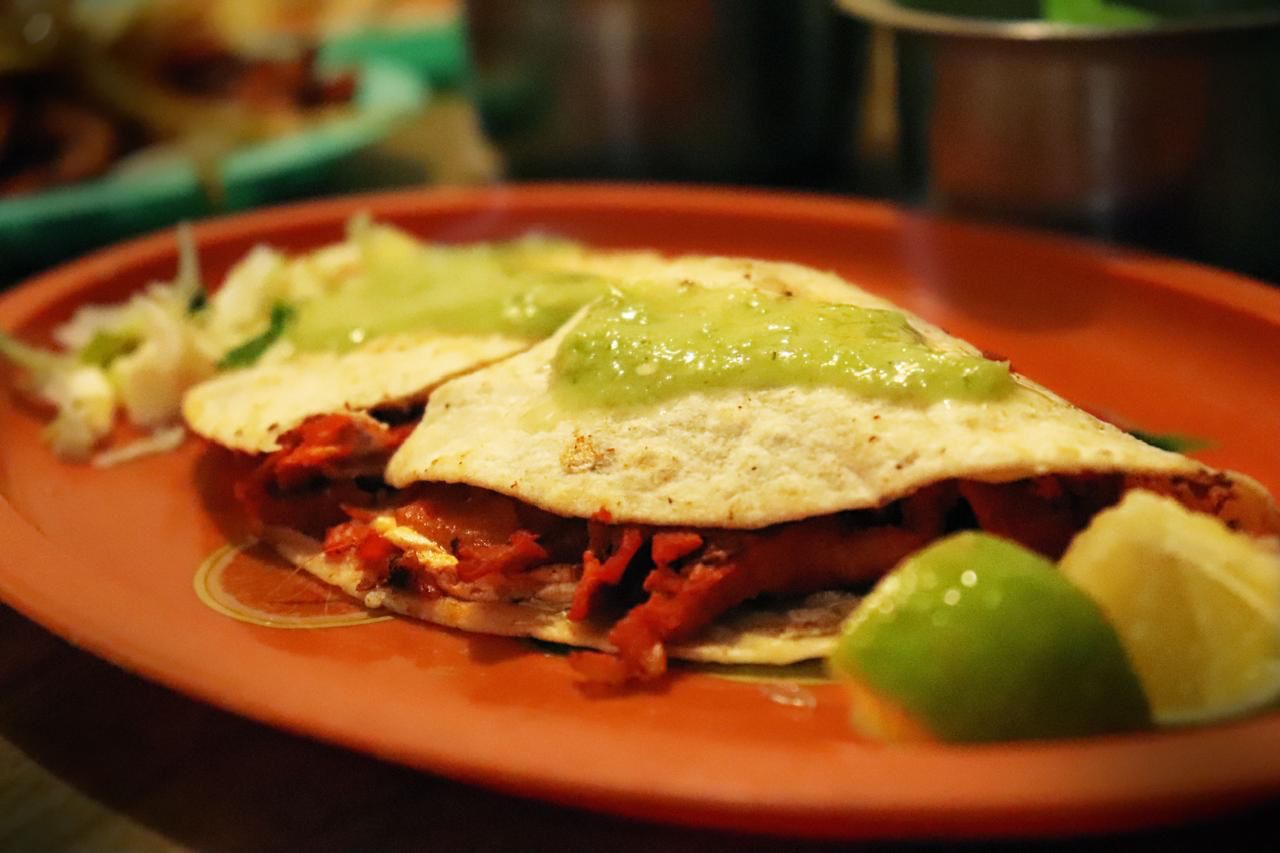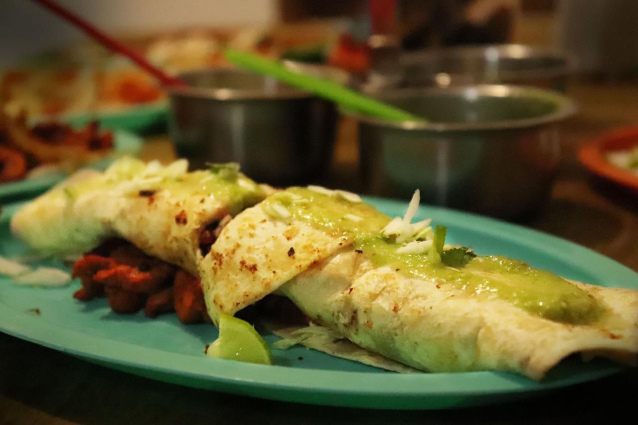 Tortilla de harina rellena de carne. Incluye salsa verde, pico de gallo, cebolla y limón.
