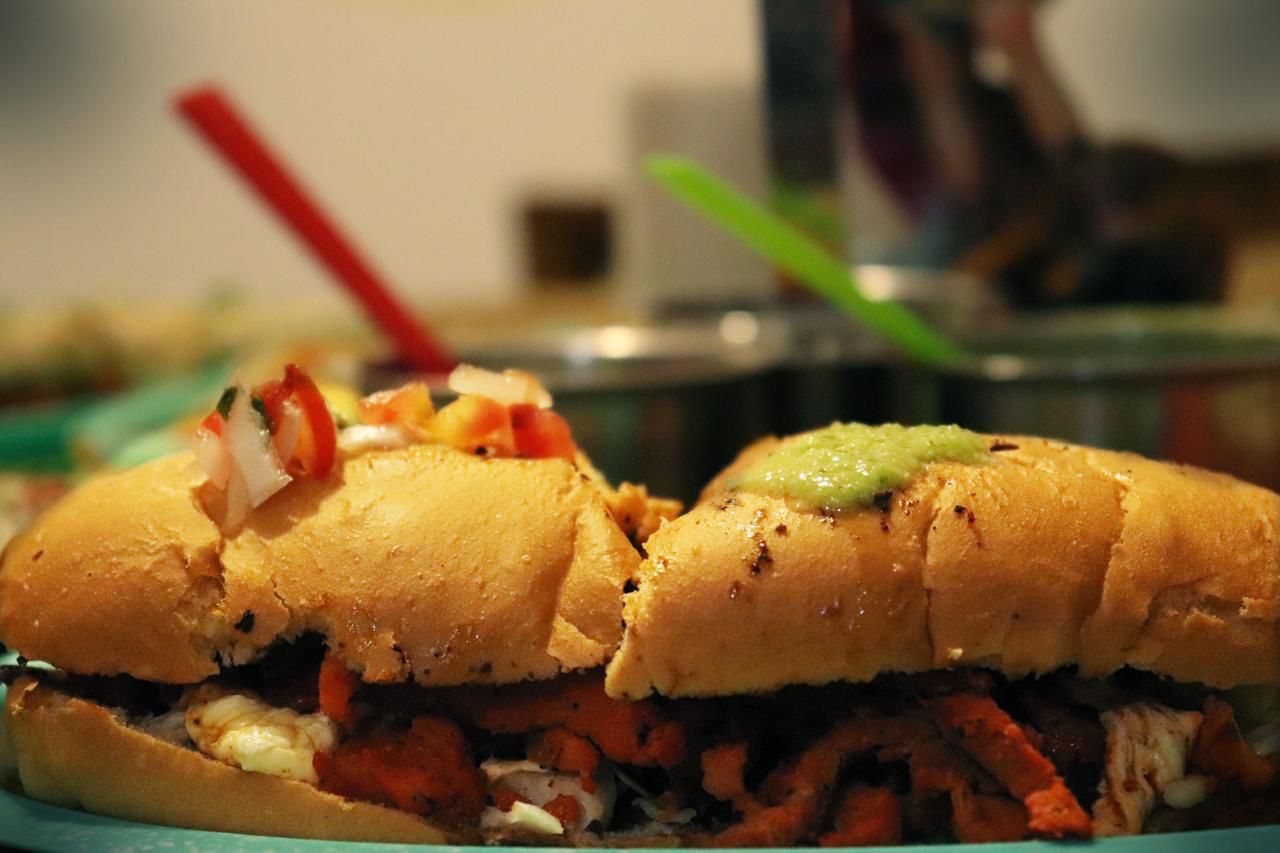 Bolillo relleno de carne. Incluye salsa verde, pico de gallo, cebolla y limón.