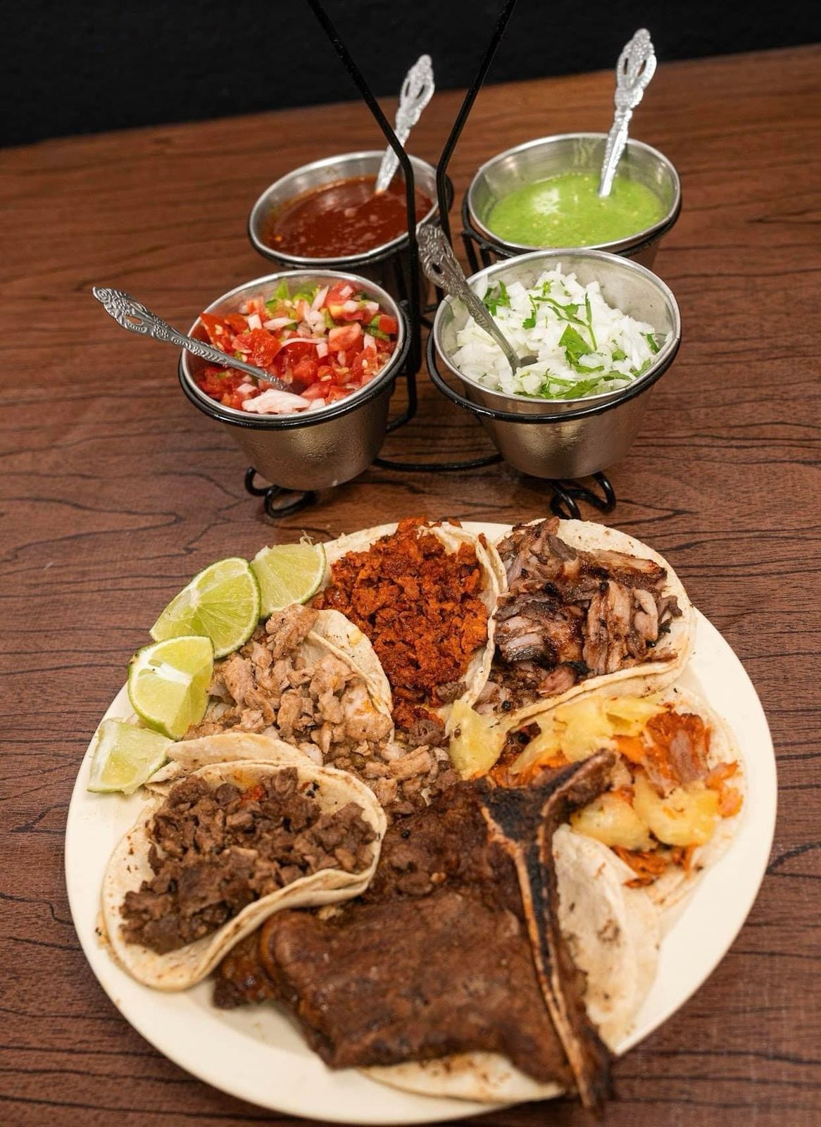 Porciones de sirloin, pastor, chorizo y chuleta, acompañadas de tortillas, quesadilla sencilla, cebolla asada, pico de gallo y salsa verde.