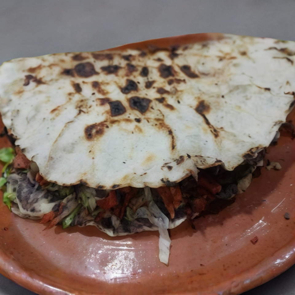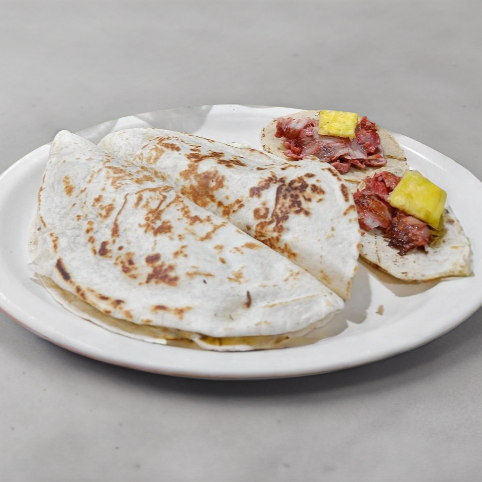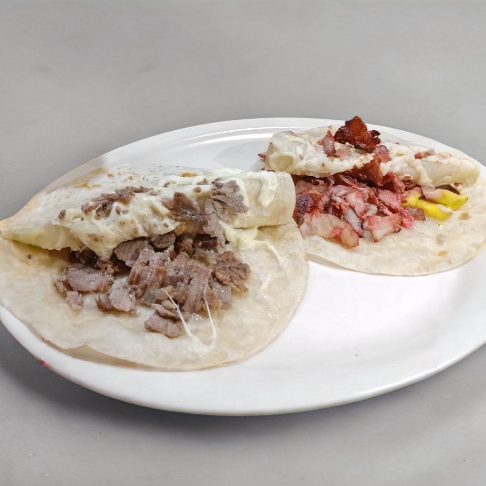 tortilla de harina dobladas, asada, o al pastor, quesillo