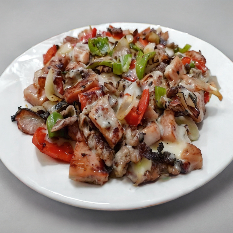 Carne de res, tocino, jamón, pimiento verde, roja, cebolla, tomate, quesillo, 4 pzas tortilla harina chica