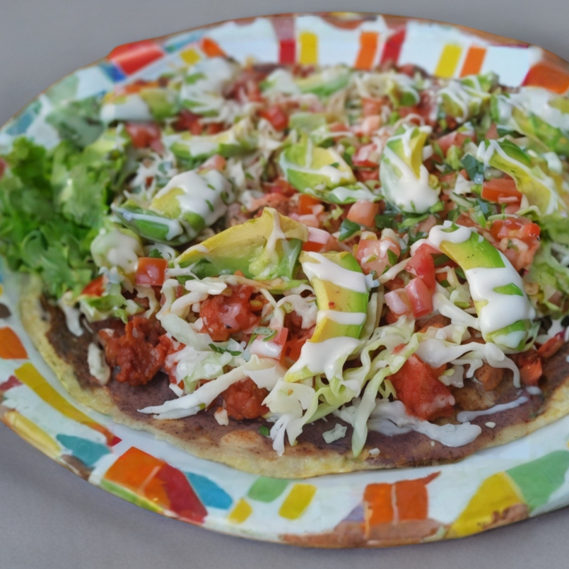 TORTILLA ECHO A MANO, CARNE ASADA, PASTOR O MIXTA, FRIJOLITO, QUESO, LECHUGA, REPOLLO RAYADO, TOMATE PICADO, AGUACATE Y CREMA