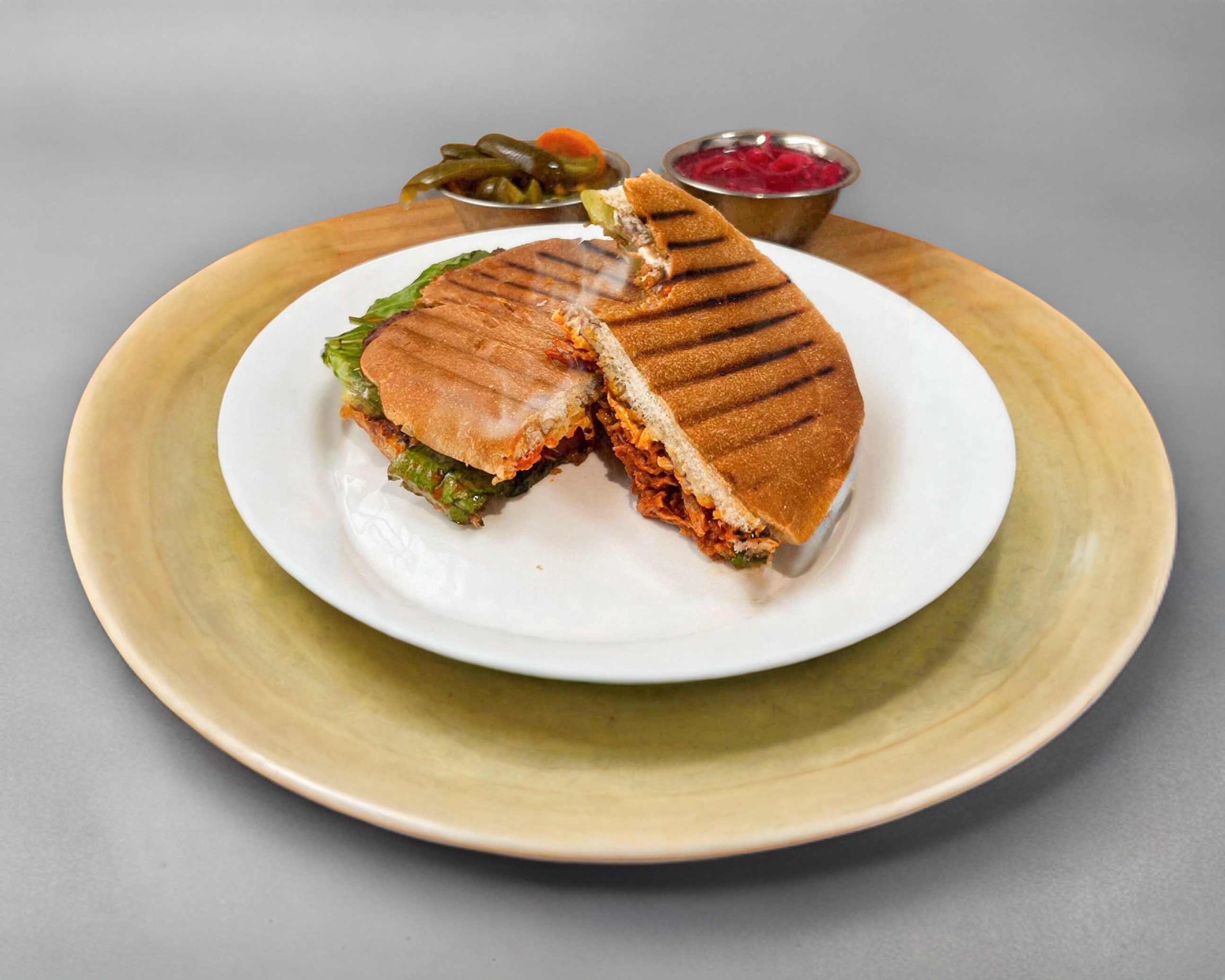 torta de cochito con frijol mayonesa lechuga tomate rojo cebolla quesillo acompañado de salsa verde y cebolla morada encurtida