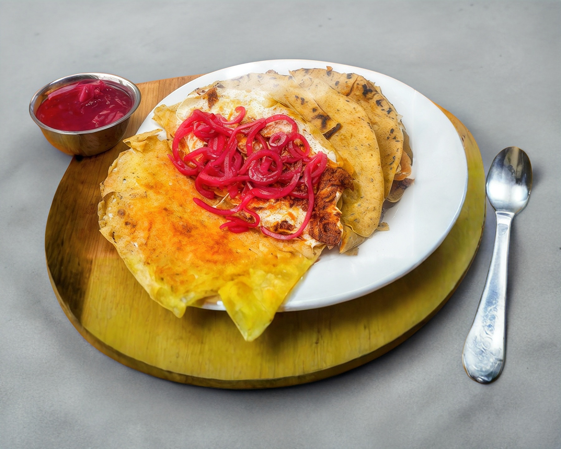 Quesadilla con tortilla echa a mano, quesillo y carne de casa blanca.