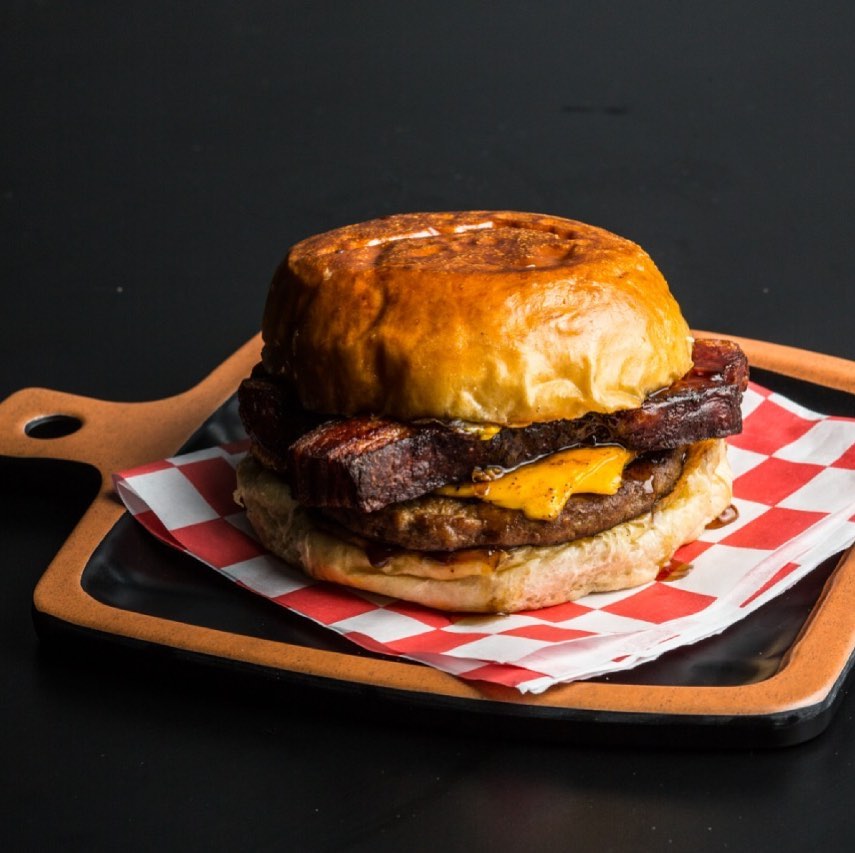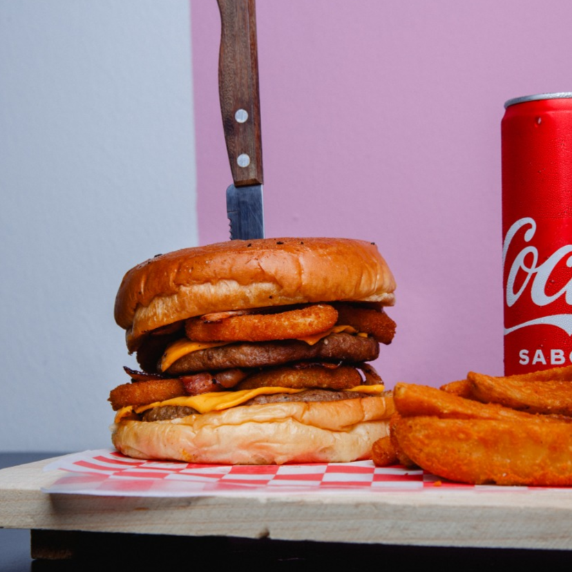 Pan brioche, doble carne, doble queso amarillo, doble tocino y aros de cebolla, sin vegetales.