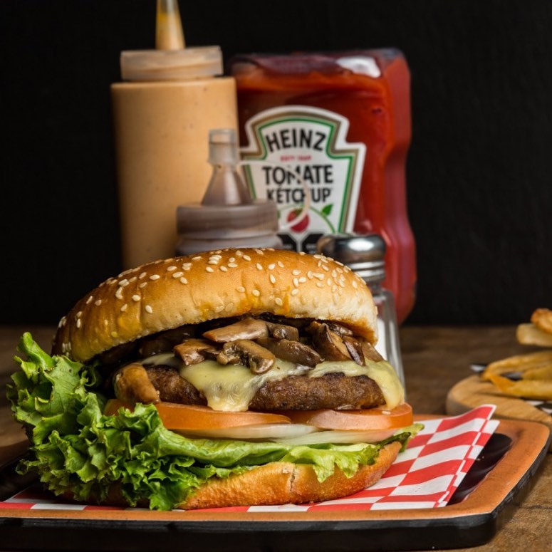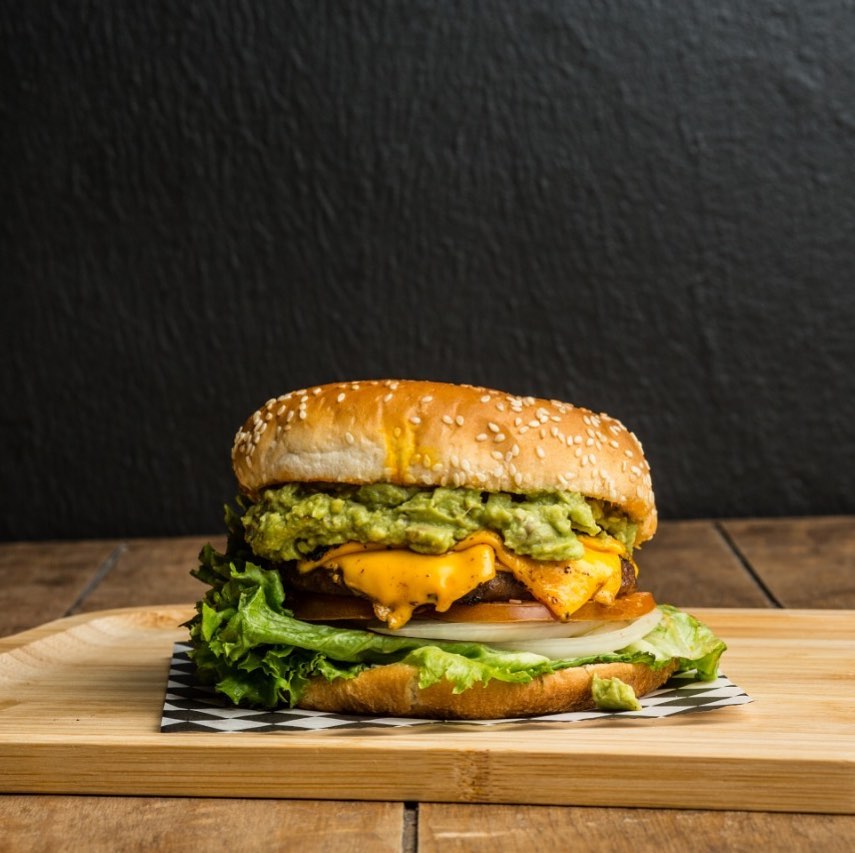 140 grs de carne, lechuga, tomate, cebolla, catsup, mayonesa, mostaza, guacamole y queso amarillo