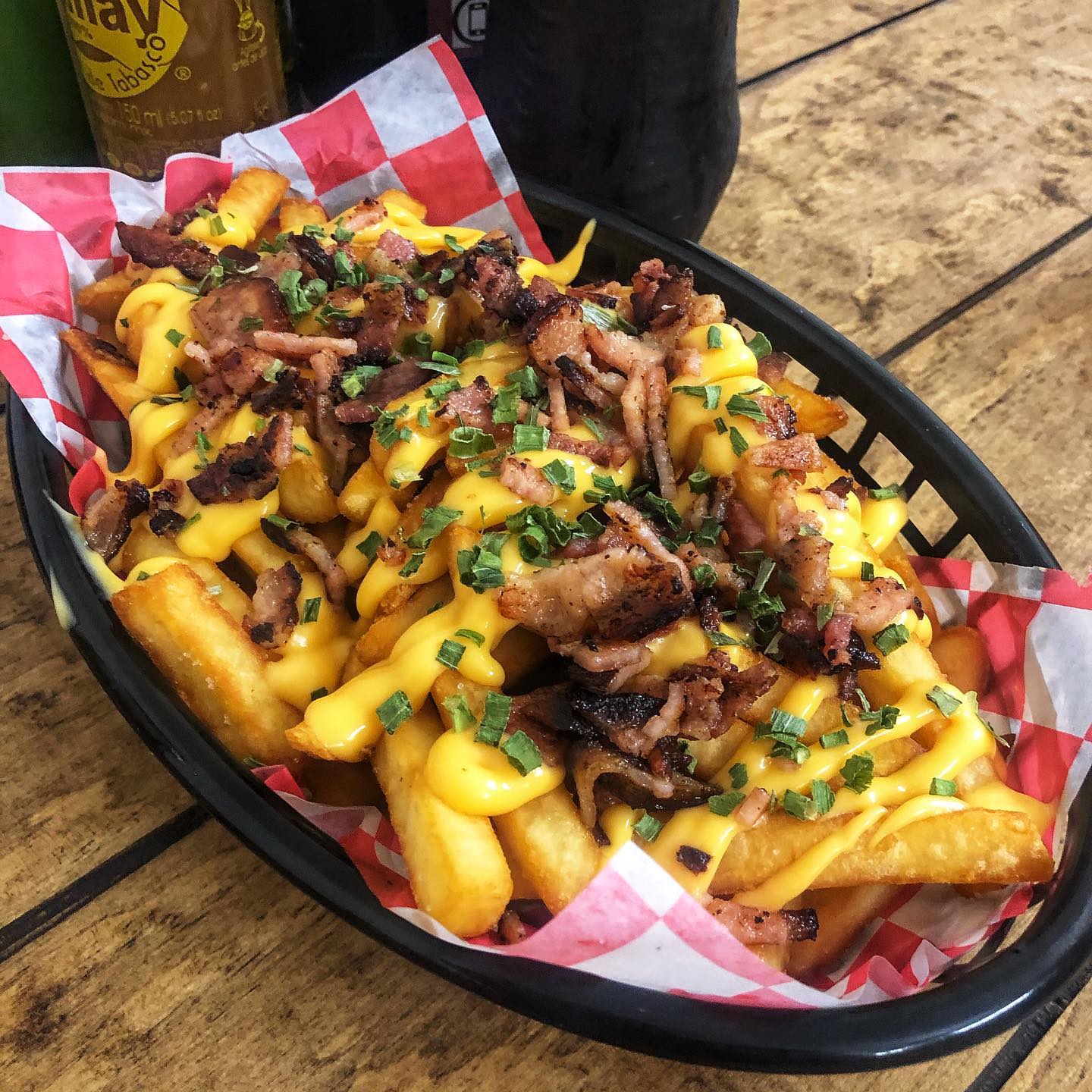 200 Gr. de papas a la francesa con trozos de tocino ahumado, acompañado de aderezo de queso.
