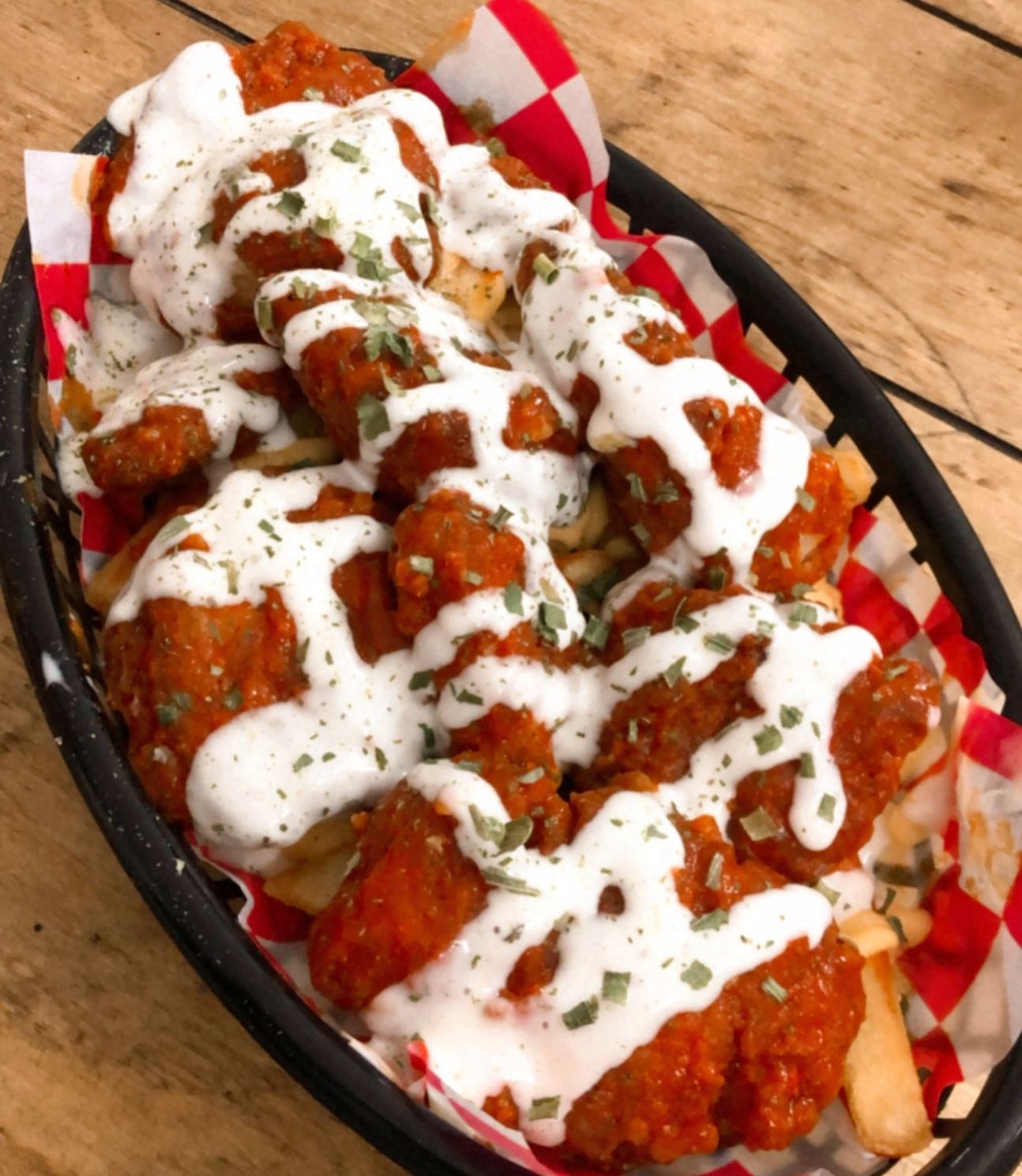 200 Gr. de papas a la francesa con trozos de pollo, empanizados bañados en salsa búfalo, ranch y queso.