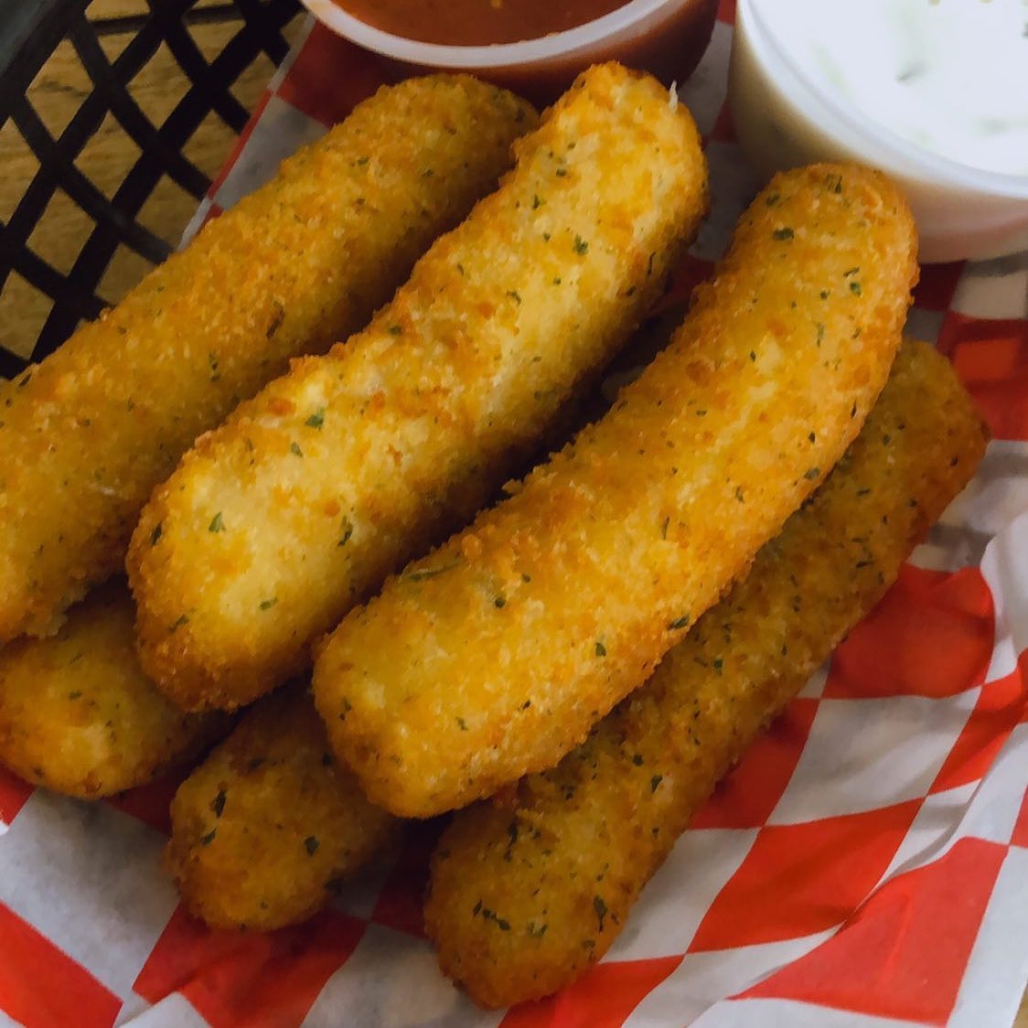6 Piezas de palitos de queso mozzarella, empanizados y acompañados de salsa de tomate.