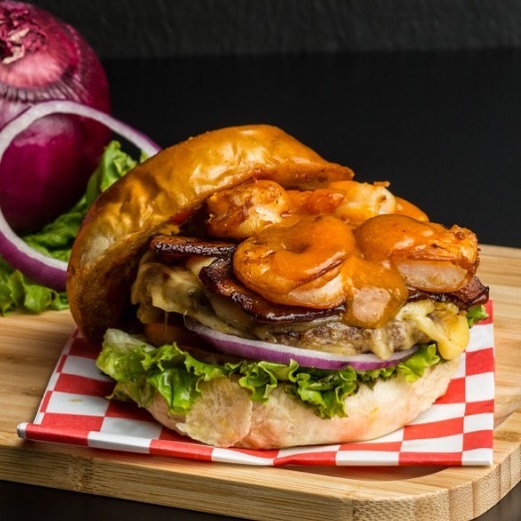 140 grs de carne, pan brioche, camarones con salsa mango habanero, queso gouda y tocino
