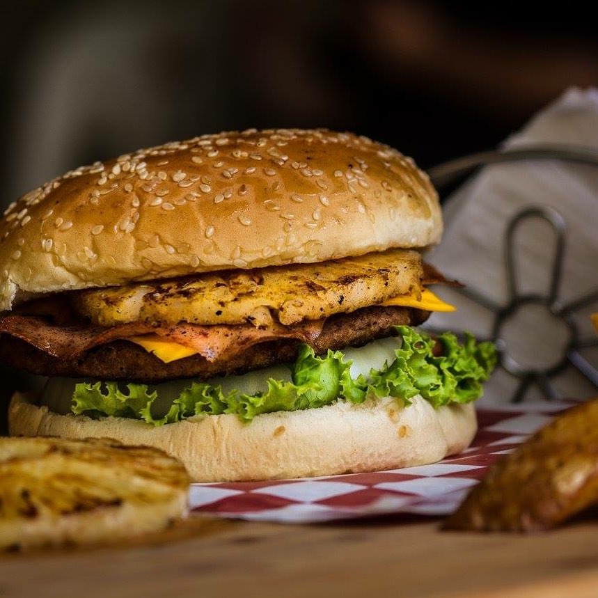 140 Gr. de carne, lechuga, tómate, cebolla, aderezos, queso amarillo y tocino.